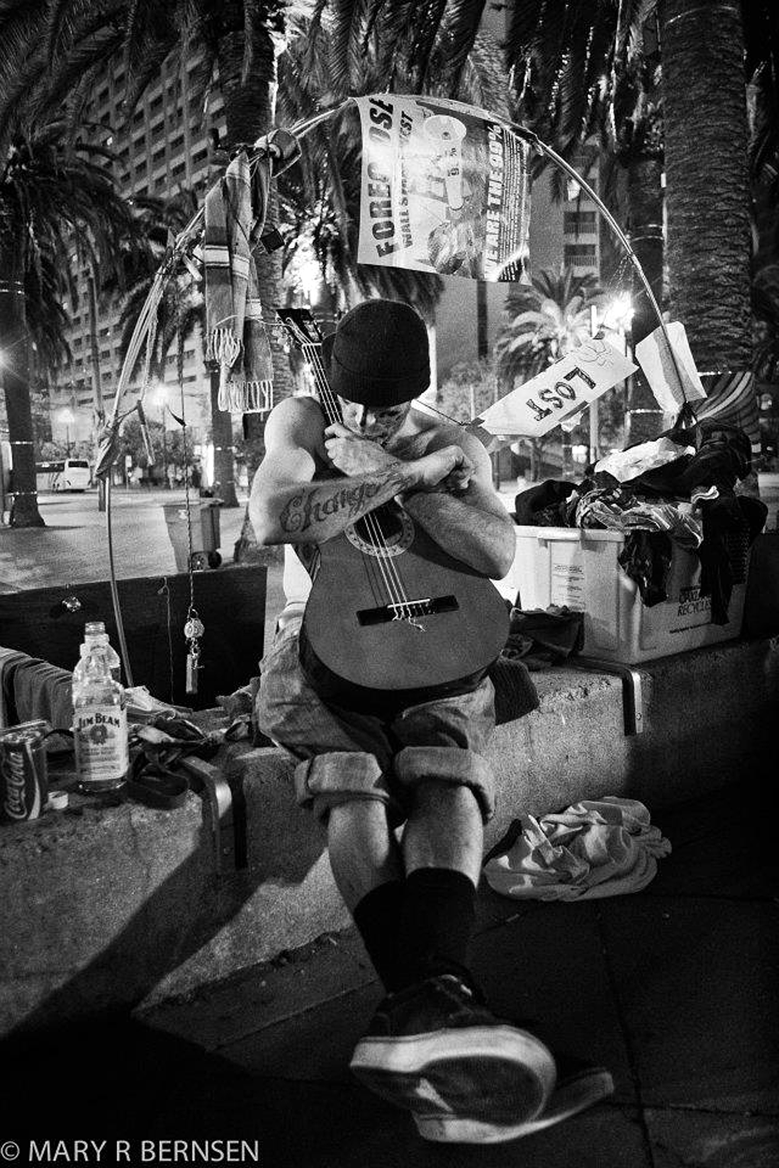 Some of the images evoke common experiences from protests across the country last month—a man holding a rubber bullet in front of the bruise where it hit him, for instance. Others are artistic portraits of life in Occupy encampments—a man sitting shirtless next to an altar, cradling a guitar in his lap, the word “change” tattooed in scrawling letters on his forearm.