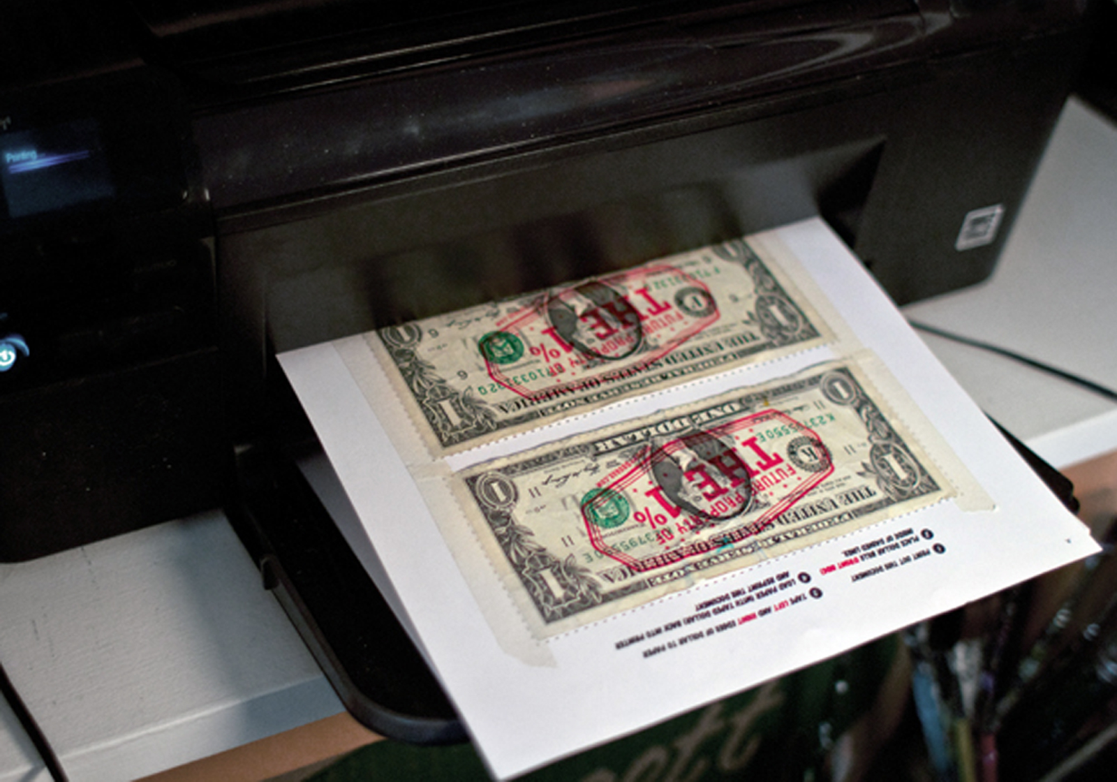 The majority of Occupy George dolalrs are printed on home computers using a free online template. Photo by Andy Dao.