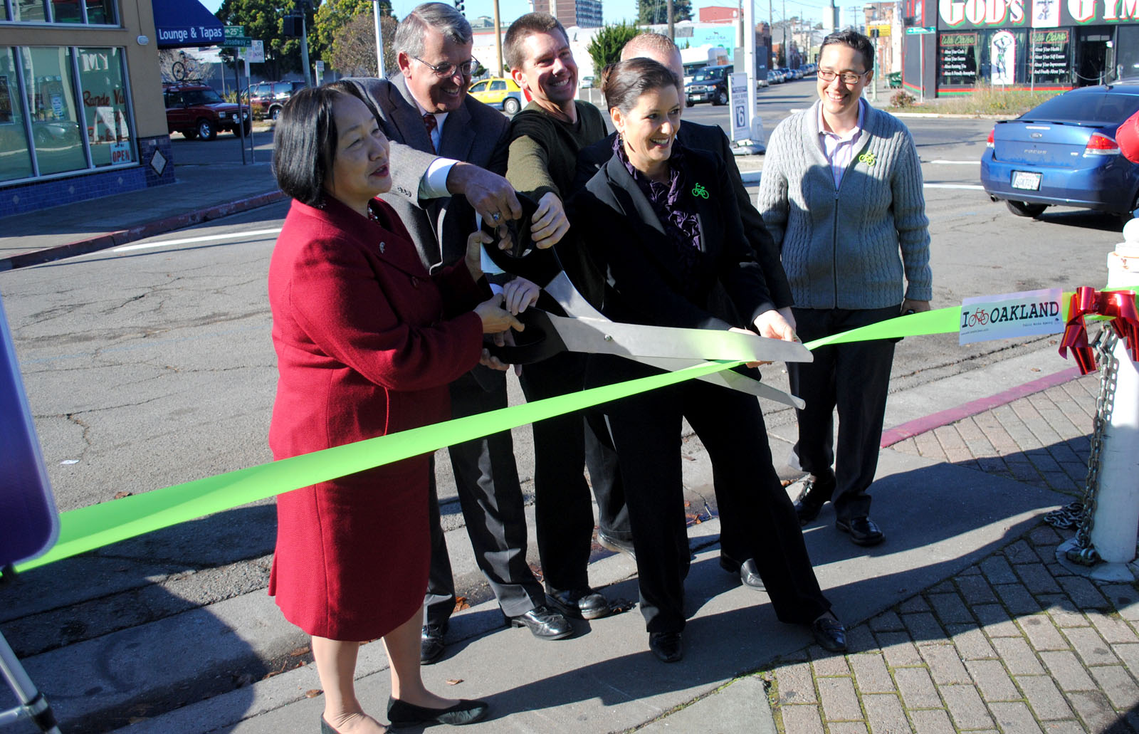 Mayor Jean Quan and Councilmember Libby Schaaf (District 4) were among the speakers at the event, which was hosted by Renee Rivera, the East Bay Bicycle Coalition’s executive director, as well as Walk Oakland Bike Oakland. Quan said the new bike lanes will be important for helping people get to work in a safer way, but will also aid the city in reducing greenhouse emissions. “To get to those goals, every one of us has to eliminate at least one of our car trips a week,” she said, to applause from the crowd. “And the easiest and best way to do that is by riding your bike, right?”