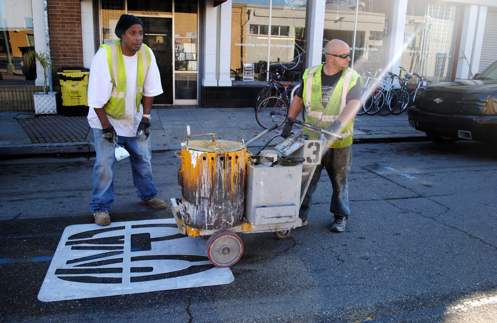 Contractors working with the city’s public works department paint a new bike lane on Webster Street.
