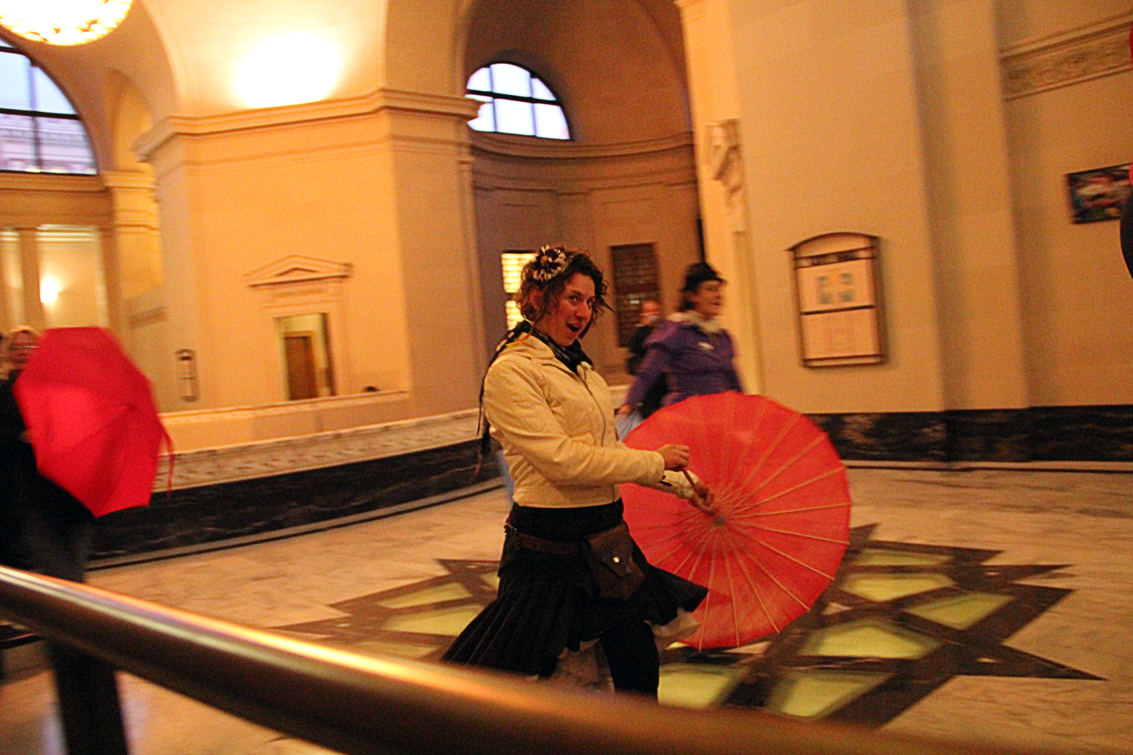 On Monday afternoon, the group of umbrella-wielding protesters marched to the City Administrator’s office. Three protesters sang a Mary Poppins-like tune with lyrics about how “We are the 99 percent” while using their umbrellas as props, dancing in a circle as they sang.