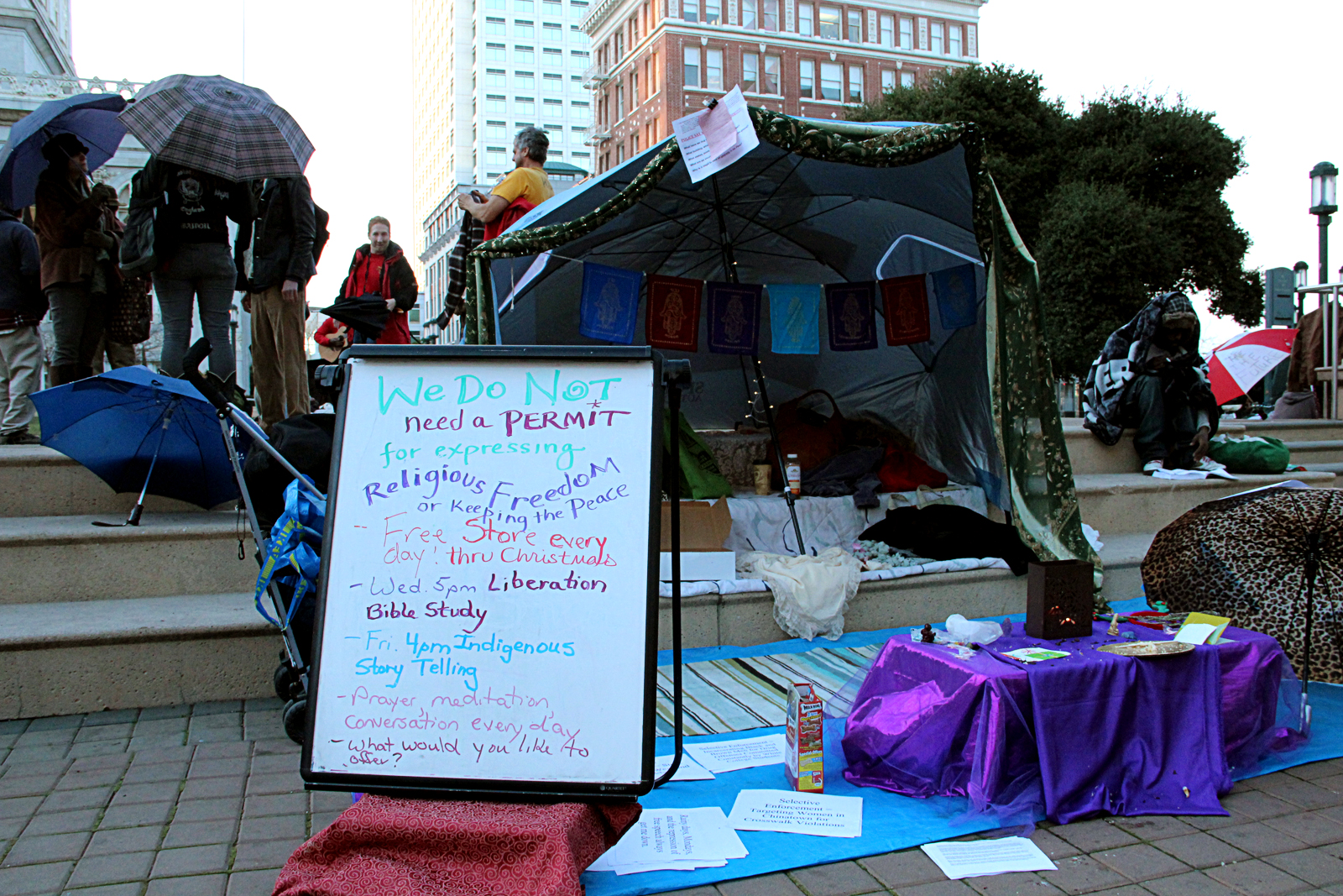 While Oakland officials allow protesting during the day at the plaza, overnight camping and the erecting structures are not tolerated. While the Interfaith Tent has obtained a permit to maintain its presence on the plaza during the daytime hours, a week ago a permit for a canopy was denied by city officials, and the group’s members say they are unclear about why it was refused.
