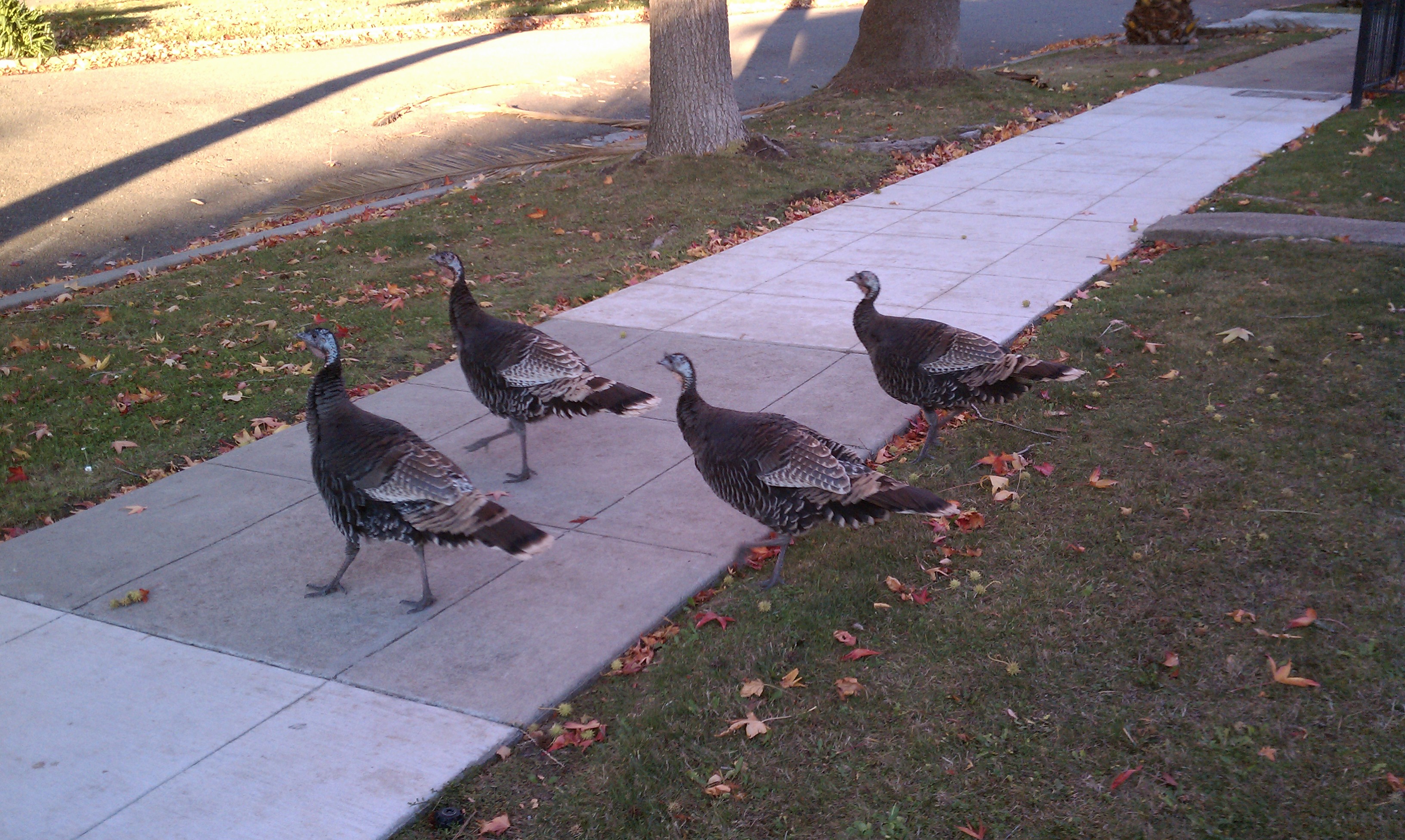 Did anyone notice these turkeys roaming about South Rockridge Boulevard near Broadway on Wednesday? Oakland North editor Cynthia Gorney spotted four of them out for a stroll and took these photos.