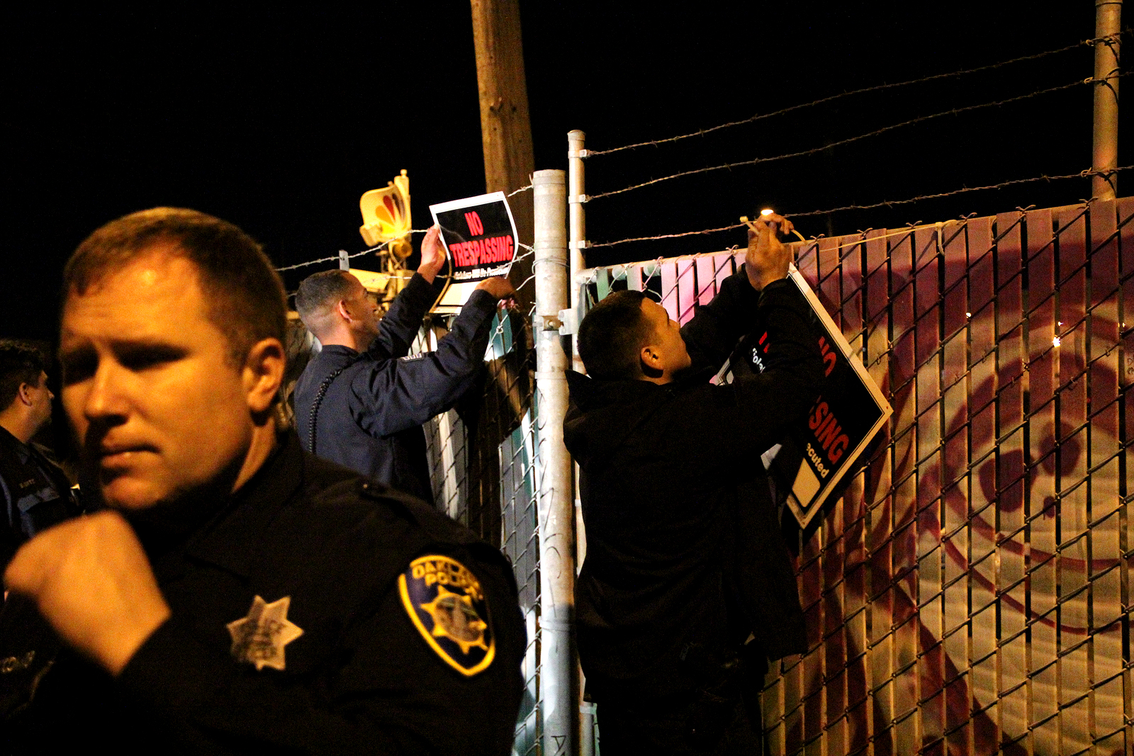 - OPD officers place numerous “No Trespassing” signs around the gates of the private lot where Occupy Oakland campers were at.