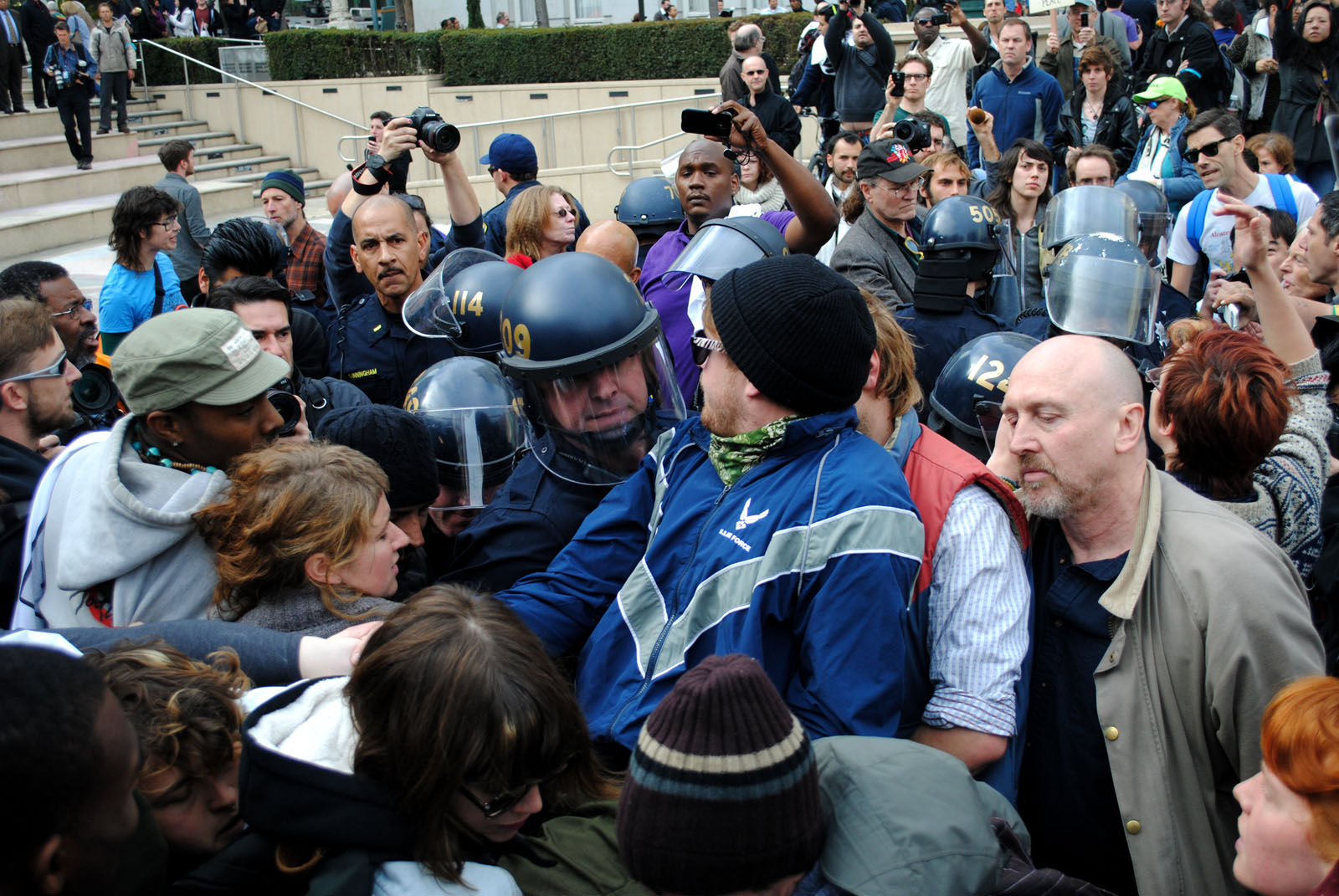 While the people speaking soon quieted, someone played Marvin Gaye’s “What’s Going On” on the speakers. About five police officers dressed in riot gear then began to move through the crowd, evidently in search of the sound equipment, and then struggled with a big mob with protesters to grab the generator that was used to power the sound system, before the group escaped and ran toward Broadway. Some speakers were confiscated by police, according to some Occupy Oakland protesters.