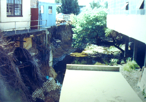 Temescal Creek, at 4701 Grove St. (on left) in 1982. This culvert was probably completed in the mid-1960s in conjunction with the BART and Grove-Shafter Freeway construction projects. (Jeff Norman note). Courtesy of Shared Ground and the Alameda County Flood Control and Water Conservation District.