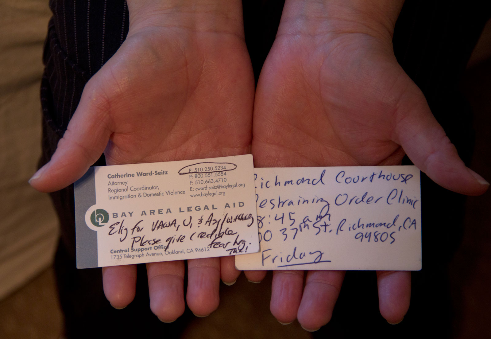 “I used to sleep with these cards,” she said turning them face forward to reveal the lettering: “Bay Area Legal Aid: Attorney Catherine Ward-Seitz.”