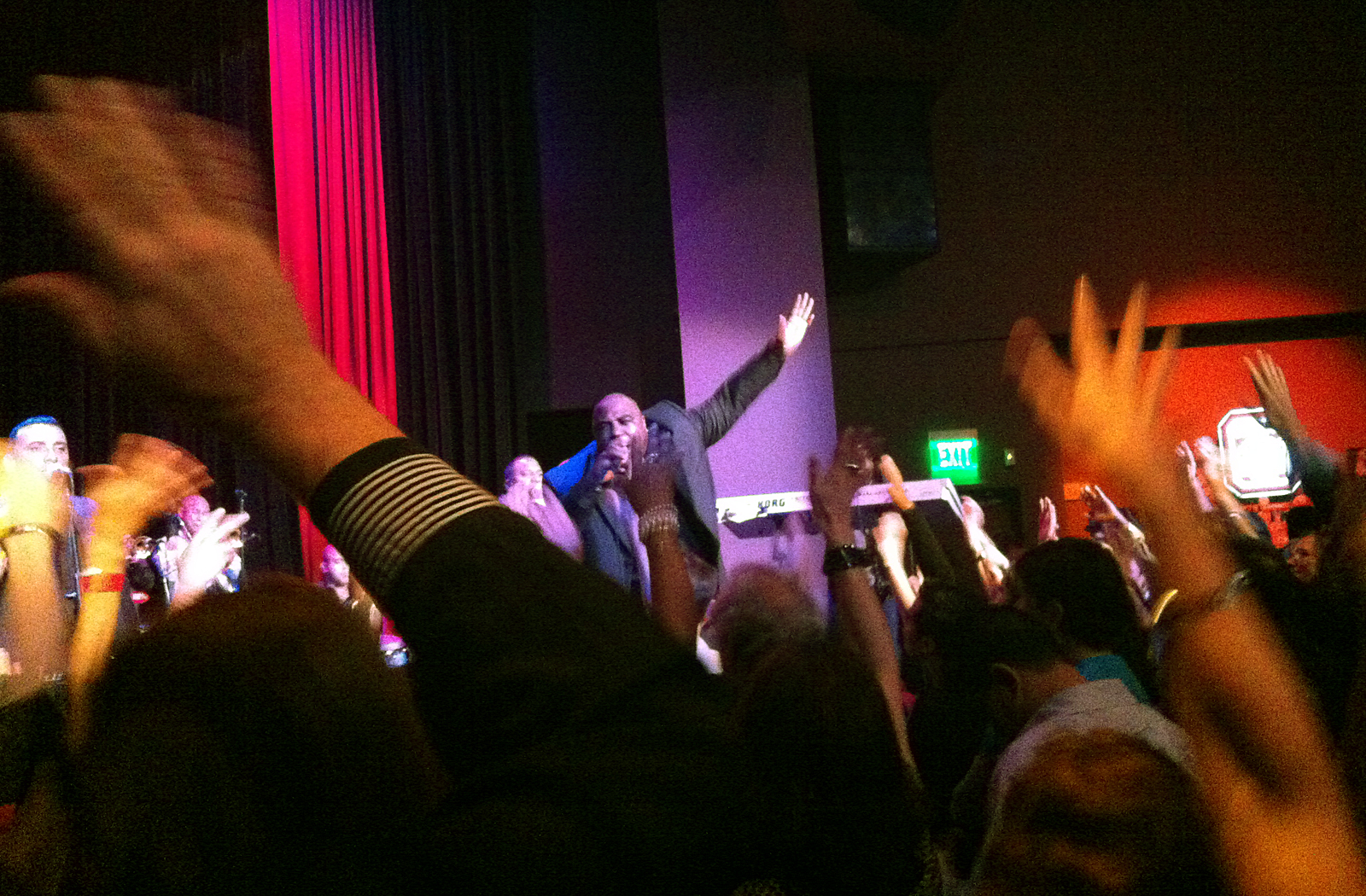 His band moves from homage to Earth Wind & Fire—a band they’ve opened for in the past—to a polyrhythmic Latin jam. The dance floor fills and the crowd soon starts chanting: “David, David!”