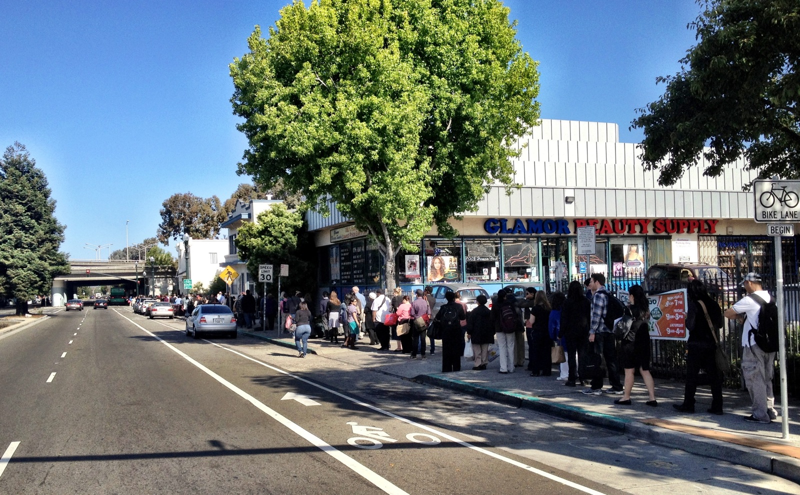 I biked to work in perfect bliss, wondering why cars were creeping along 580 and hundreds of people were lined up around the block in downtown Oakland. Now I know why.