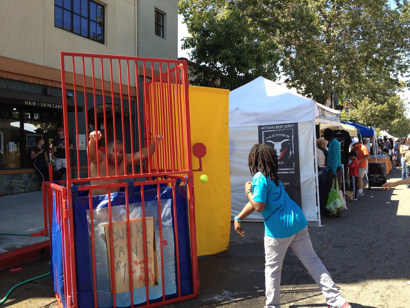 Julie Stevens is the owner of 17 Jewels Salon & Spa, and has participated in the fair for seven years. This year, the fair’s dunk both was set up in front of her shop to raise money for Destiny Creative Arts Center in Oakland, an organization that runs violence prevention programs for kids and teens. There was a long line of people who waited to hand over a dollar in order to see neighborhood resident Hugo Yela fall into the tank repeatedly throughout the afternoon.