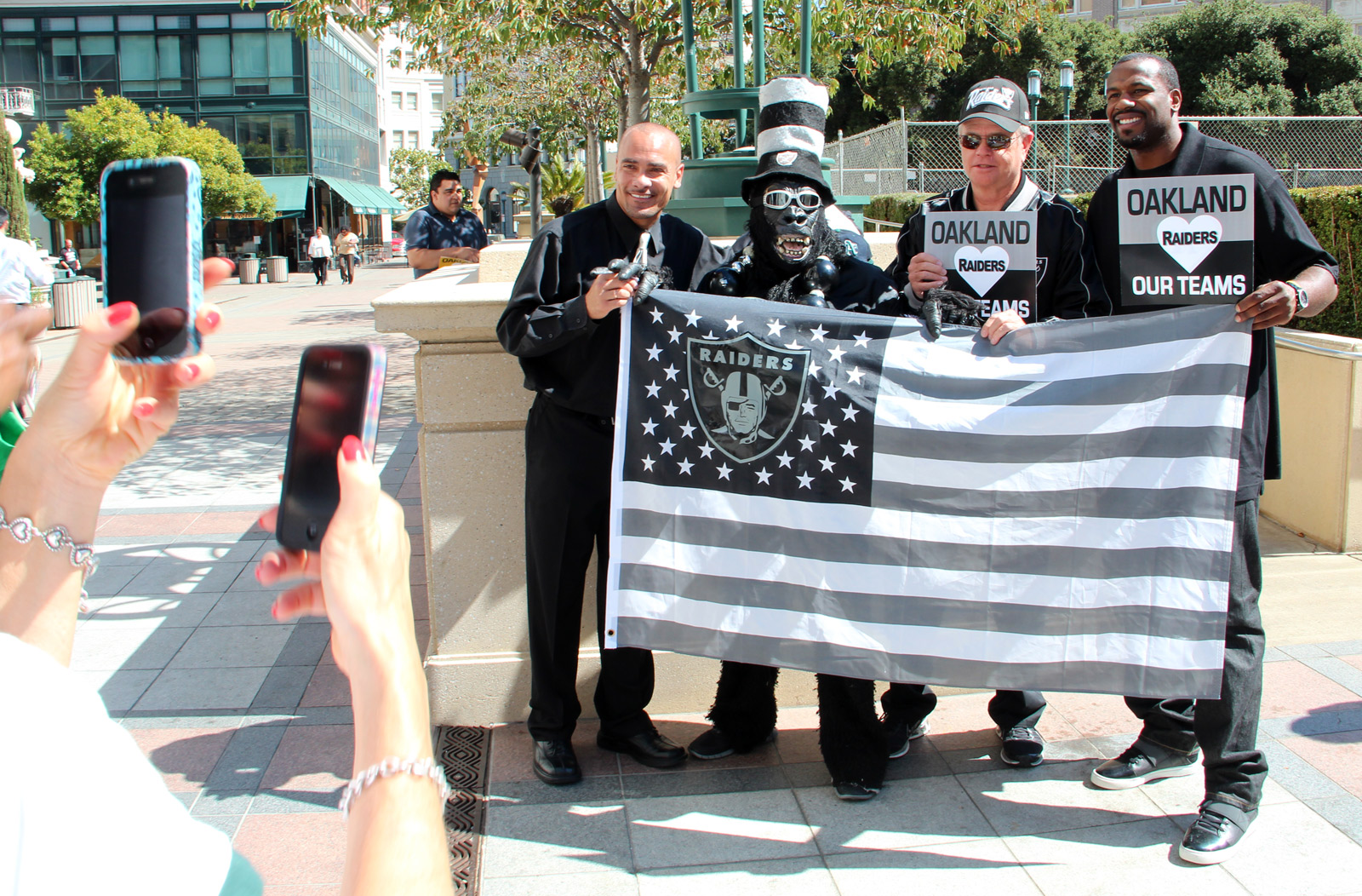 The crowd was full of Raiders jerseys, Oakland A’s paraphernalia and signs for both teams distributed by Quan’s office. Speakers addressed the half-full amphitheatre flanked by several dozen supporters, including members of the Raiders’ “Black Hole”—a devout group of fans that includes Gorilla Rilla, a fan who wears a black gorilla suit, goggles, hat and over-sized silver and black jersey, and Dr. Death, who wears a long black wig, shoulder pads and a silver helmet spiked with (fake) knives. “Mayor Quan called me personally and asked me to come out today to show my support,” said Dr. Death. “It’s more than being a fan, it’s fandemonium. It’s our livelihood. We live for this.”