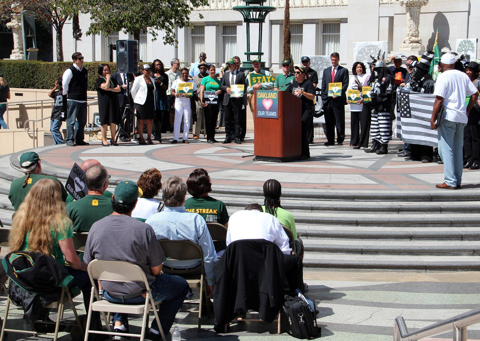 […] August 2012 – Mayor Jean Quan holds a press conference attended by several hundred A’s, Raiders and Warriors fans outside Oakland City Hall. Quan announces that “Oakland Loves Its Sports Teams Week” will be celebrated from Sept. 10-14, 2012. […]