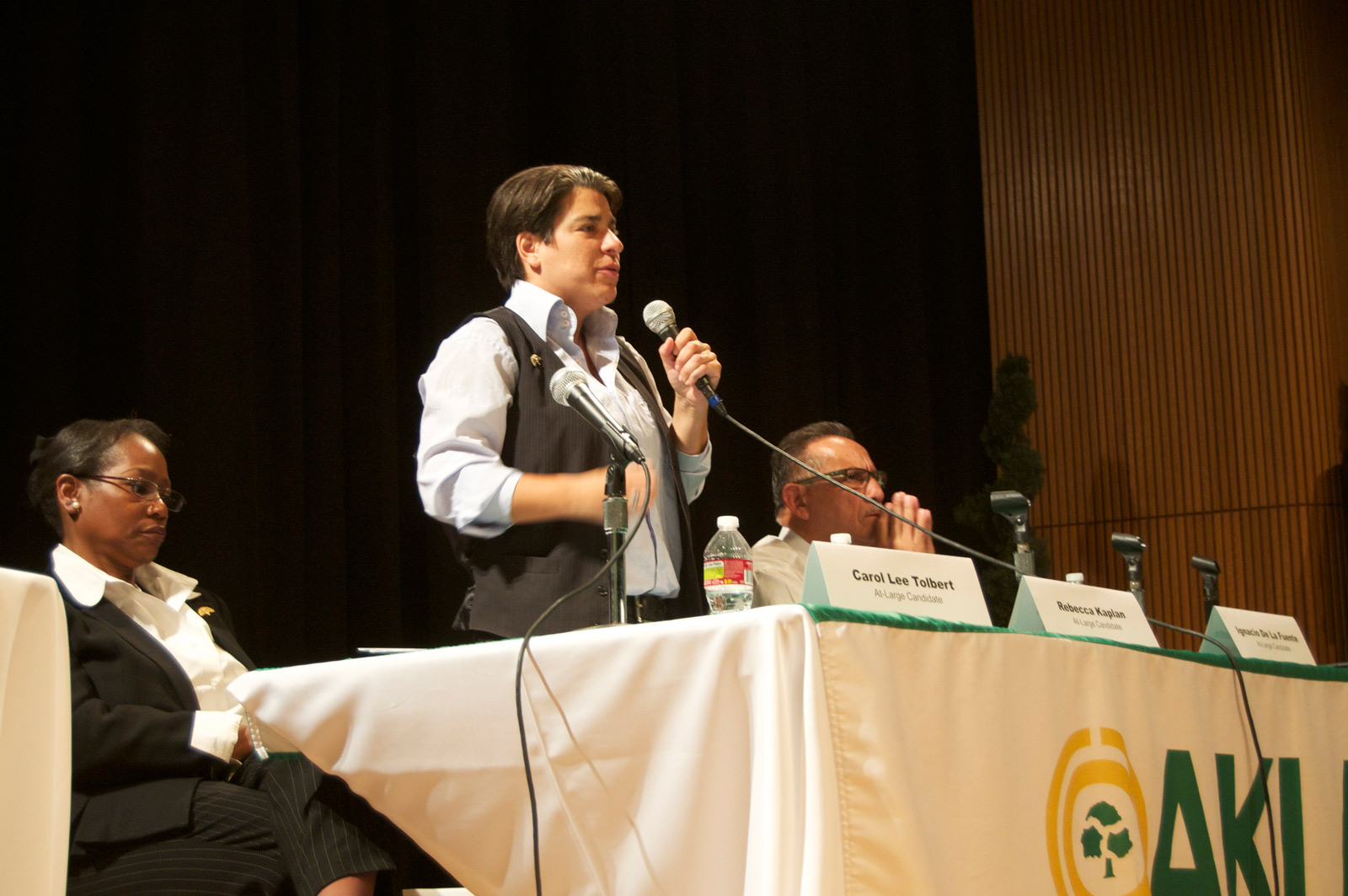 […] Now, four years later, she’s up for re-election, and she’s running against longtime District 5 city councilman Ignacio De La Fuente, as well as Carol Lee Tolbert, a former Oakland Public Schools board member who served from 1992-1997, and Theresa Anderson-Downs, who identified herself as an Oakland native and mother. … Kaplan said the department needs more officers on the streets. She pointed to recent police layoffs, which she said had led to officers working longer hours. “When you’re working a double or triple shift, things are more likely to go wrong,” she said. … Kaplan said police should focus on other methods such as stopping the import of illegal guns. “I know that our city will succeed when we get the jobs in and the guns out,” she said. … Kaplan said the answer is to build a more diverse ecosystem for business in Oakland—with small businesses such as Blue Bottle Coffee and Linden Street Brewing Company as the forest floor, and big lofty projects—including the Oakland Army Base project and the Coliseum City development—as the canopy. … Kaplan said she includes retaining sports teams under economic development. “Advancing the Coliseum City project, with shops and bars and restaurants and hotels, all connected to a convention center and regional transit is an important way of expanding job opportunities,” she said. … http://oaklandnorth.net/2012/08/31/candidates-for-city-councils-at-large-seat-participate-in-forum/ […]
