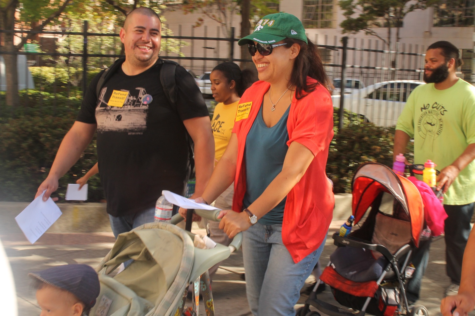 On Wednesday, members of the Alliance of Californians for Community Empowerment (ACCE) and some Oakland residents gathered at 14th Street and Broadway to protest a rumored ban against strollers on AC Transit buses. About 20 protestors marched down nearby Franklin Street chanting, “One struggle, one fight, we need our buses, it’s our right!” Some pushed their strollers with children in them towards AC Transit’s downtown office to voice their concerns on behalf of passengers who use strollers, and bus drivers who don’t make the proper accommodations for them.