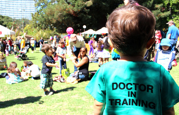 - A boy wearing a doctor’s costume observes people during the 100th anniversary of Children’s Hospital at Fairyland. Photo by Debora Silva.