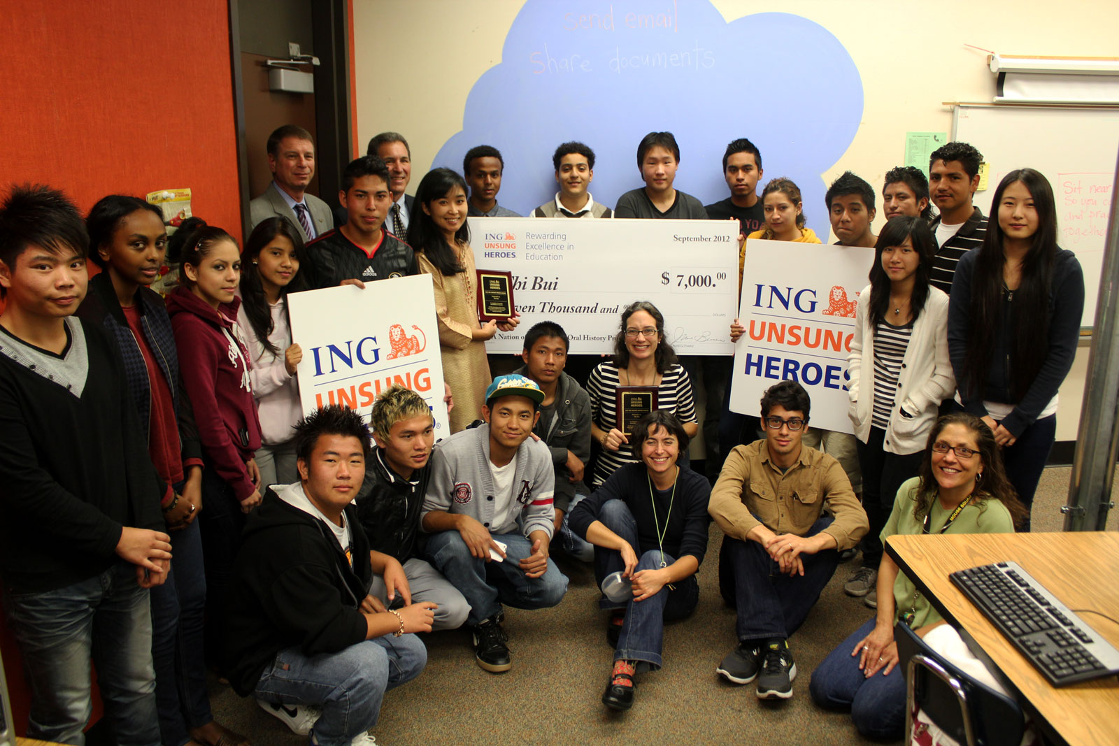 A parade of ING executives, students and school staff marched into Thi Bui’s Oakland International High School classroom on Wednesday morning to make a surprise announcement. Her 11th graders paused to look up from their computers at the spectacle as three men in suits walked towards their teacher, followed by four of their classmates holding up signs that read “ING Unsung Heroes” and a large mysterious item wrapped in brown paper.