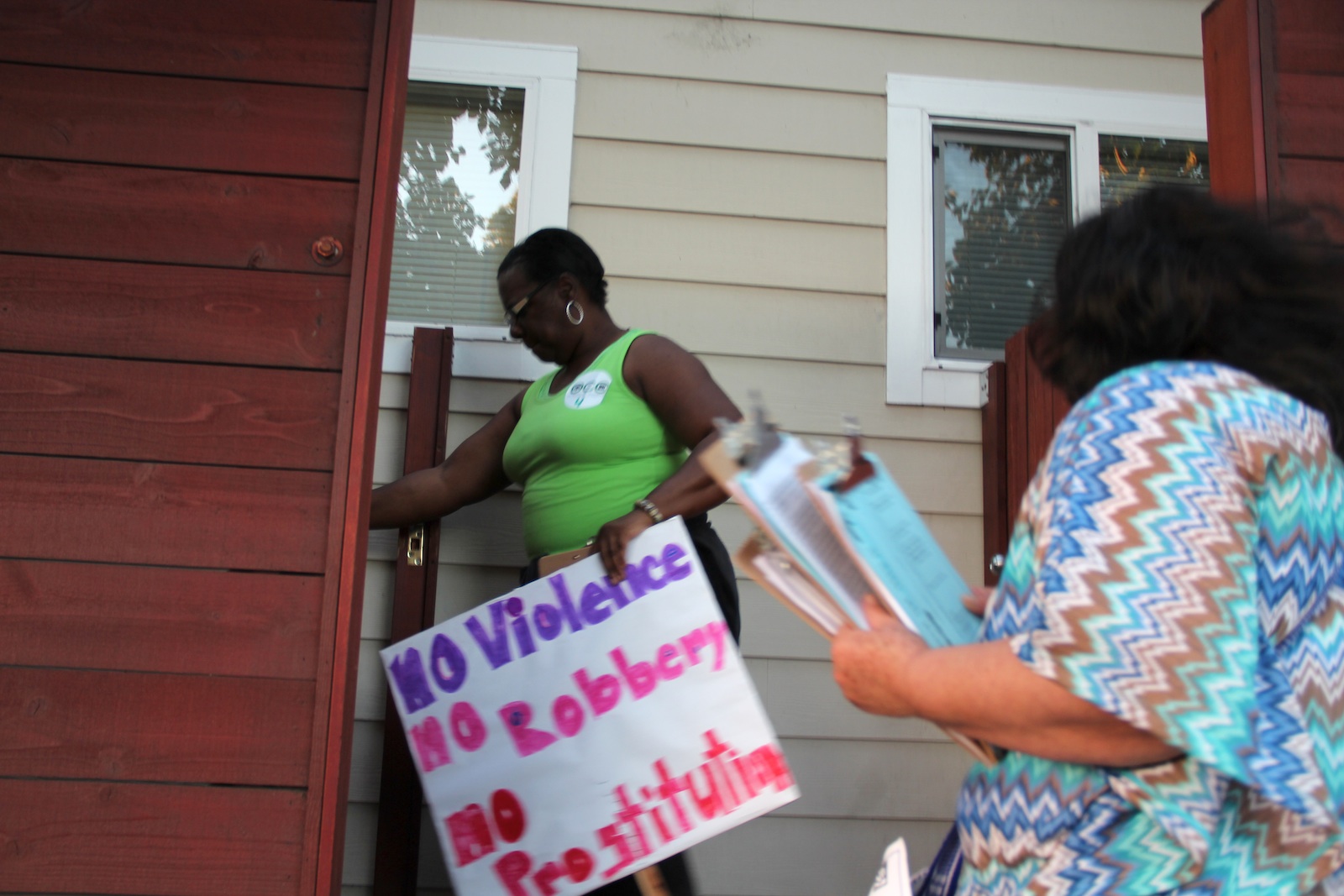 Long and other organizers went door to door, greeting wary residents with a cheery smile and friendly conversation in both Spanish and English. They encouraged neighbors to pledge their support for the campaign by writing down their names and phone numbers so that they could be contacted with further information.