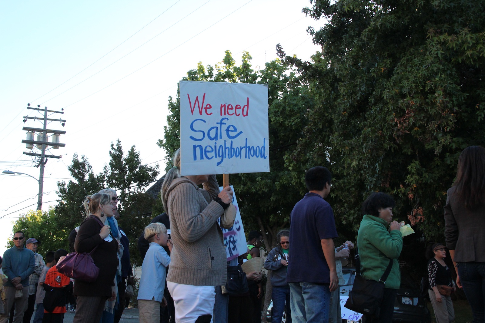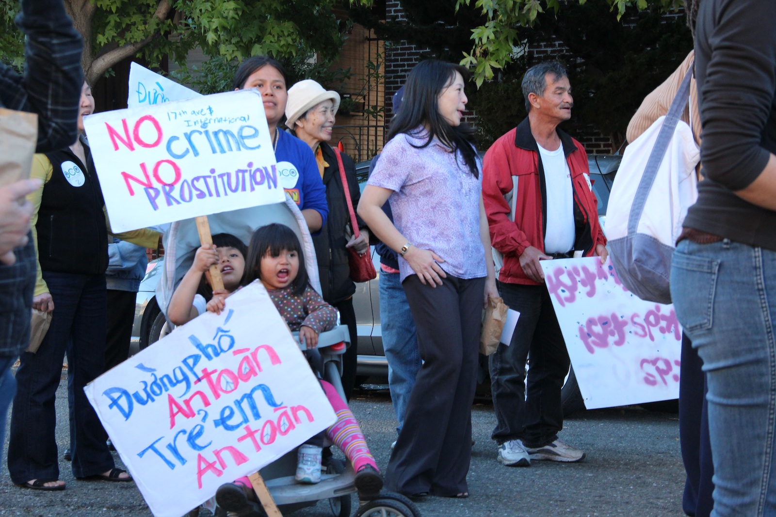 Chants rang out along East 15th Street Friday evening as residents waved multilingual signs declaring, “No crime, no robbery, no prostitution!” and, “We need safe neighborhoods!”