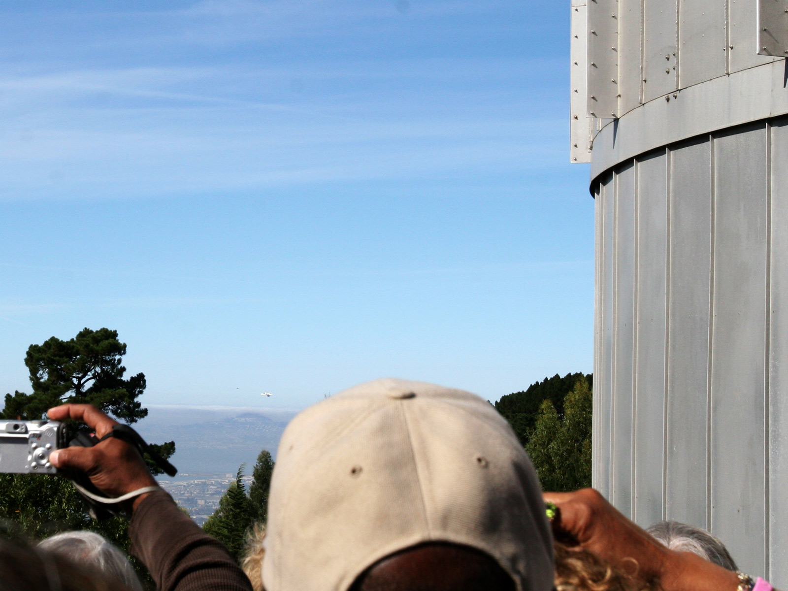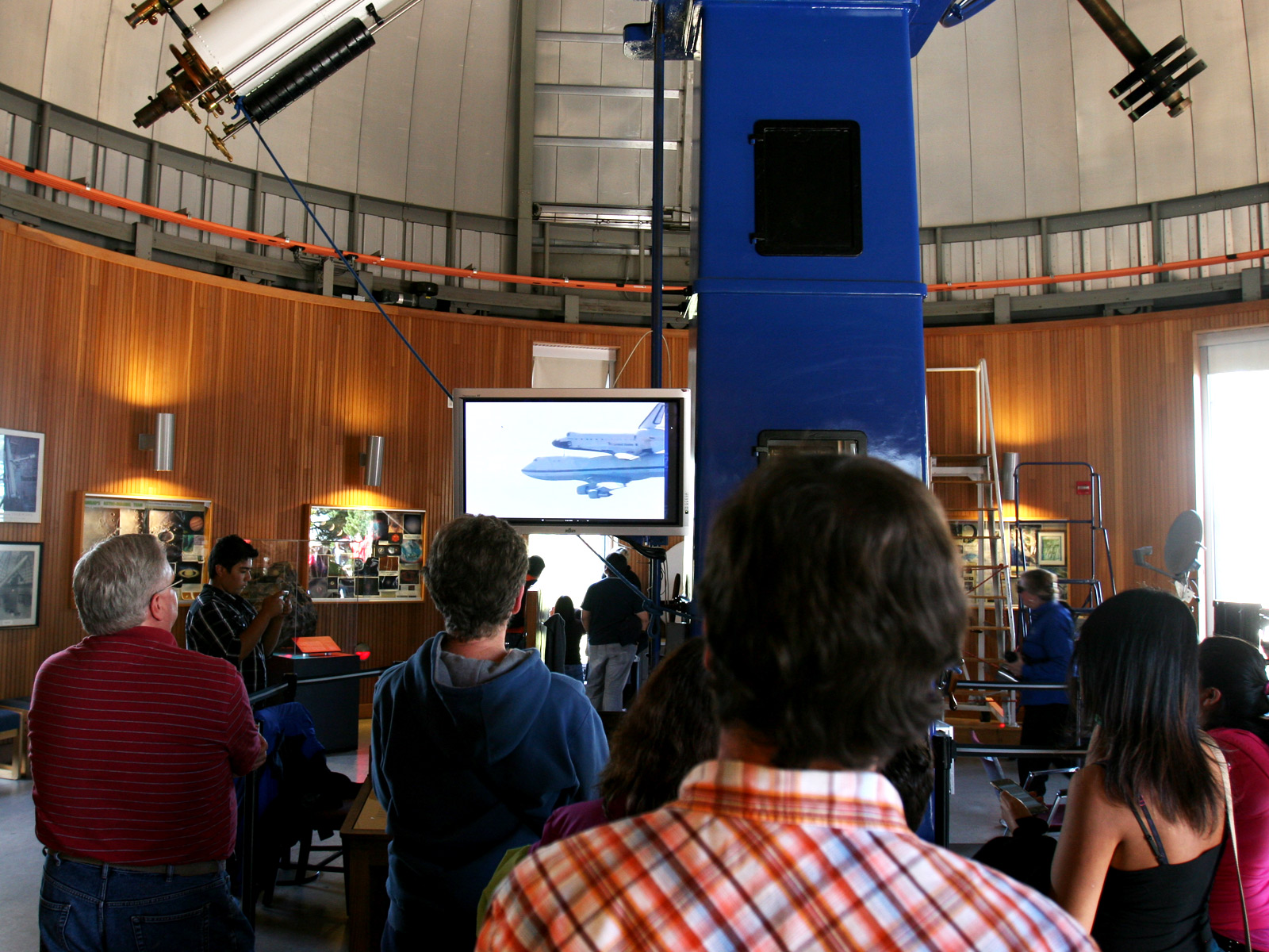 Endeavour was first sighted by Chabot visitors around 10am, barely visible through gaps in the tree line around the observatory, a smaller-than-expected white and red point moving across the horizon. “There!” people yelled excitedly, causing a tidal shift in the crowd as people moved to the fences to see through the trees. The view from the hilltop was never very clear, but the Chabot staffers played a video of a closer look at the shuttle on TV displays inside the observatory domes.