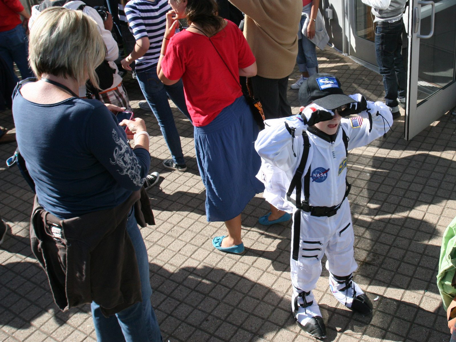 “Space is my middle name,” said elementary school student Cameron Weignant on Friday morning at the Chabot Space and Science Center as his mother adjusted the tinted visor on his helmet. While about a hundred people of all ages had come up to the observatory above Oakland hoping for a glimpse of the Space Shuttle Endeavour on its final flyover of California, only Cameron had arrived in a full astronaut costume.