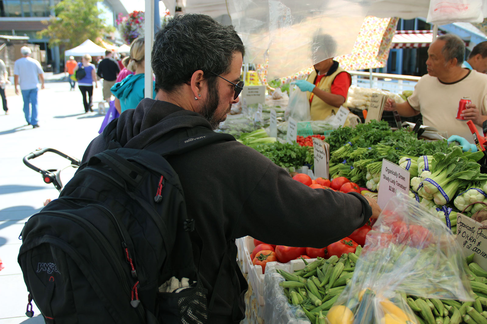 - Oakland resident JD Schreiber peruses fresh vegetables on display at the Jack London Square Farmers’ Market, where vendors accept food stamps.