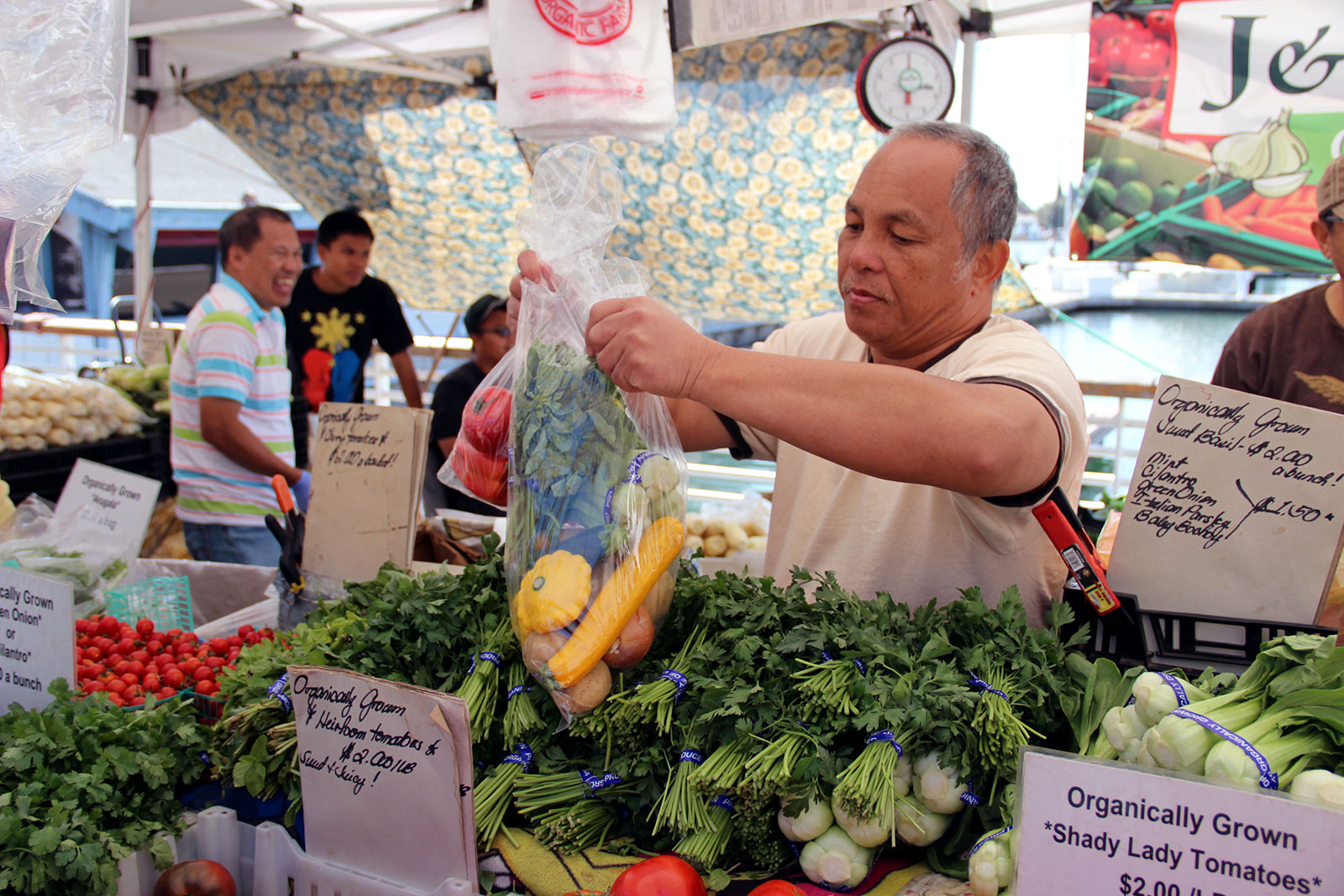 - Vendor at Jack London Square Farmers’ Market bagging vegetables for one of the market’s food stamp patrons.