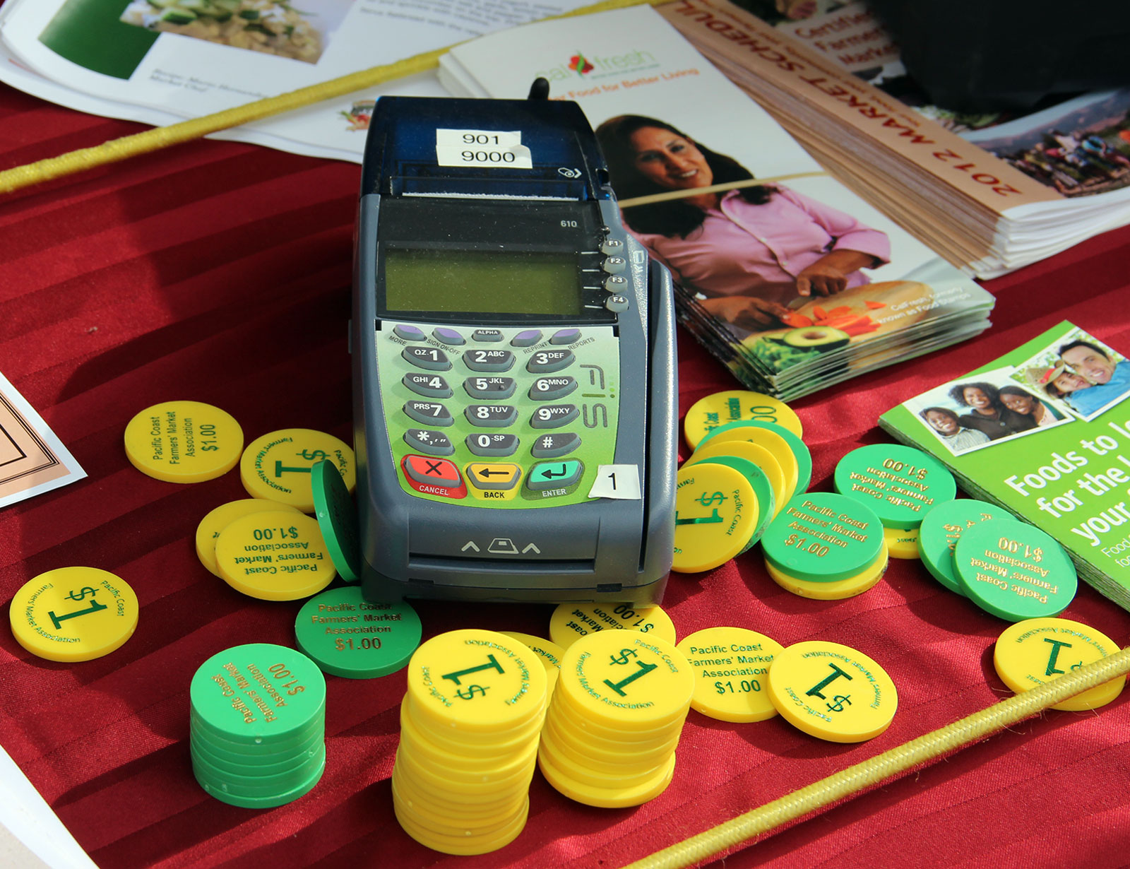 To use food stamps at the farmers’ market, customers such as Smith and Schreiber swipe their Electronic Benefit Transfer (EBT) card, which gives them access to their CalFresh benefits, provided through the US Department of Agriculture’s Food and Nutrition Service. As with an ATM, they insert their PIN into the EBT machine and then request the amount they want withdrawn from the food stamp account. Market managers at an information booth hand them tokens worth the amount withdrawn.