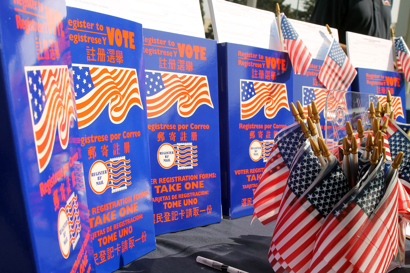 - American flags and voter registration forms sit on a table during National Voter Registration day in Oakland.