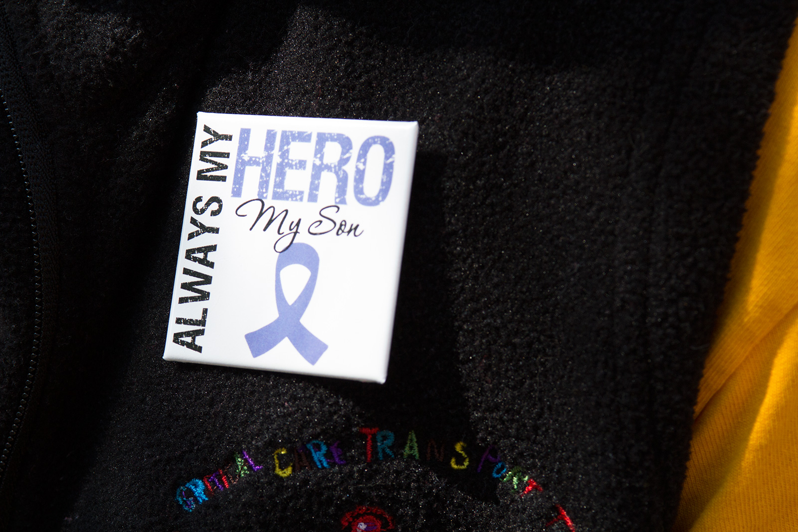 - Woman wears pin commemorating National Childhood Cancer Awareness Month.