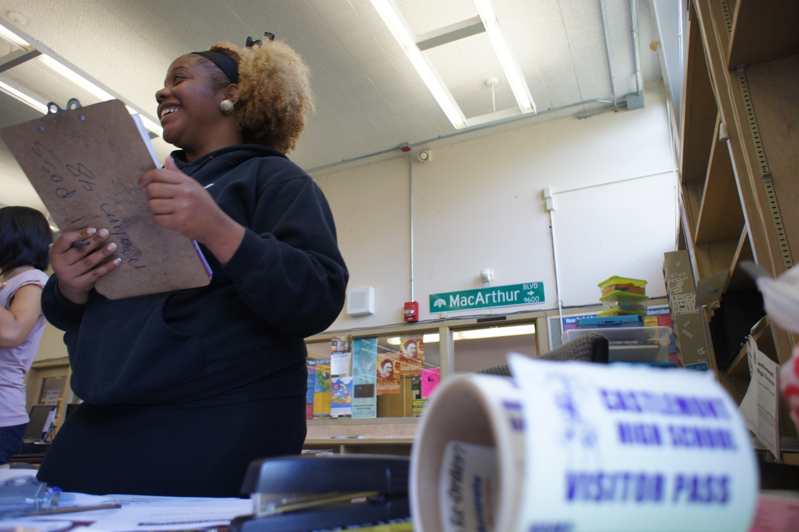 - Chinyere Tutashinda passes out visitor passes and peacekeeping positions at Castlemont High School in East Oakland.