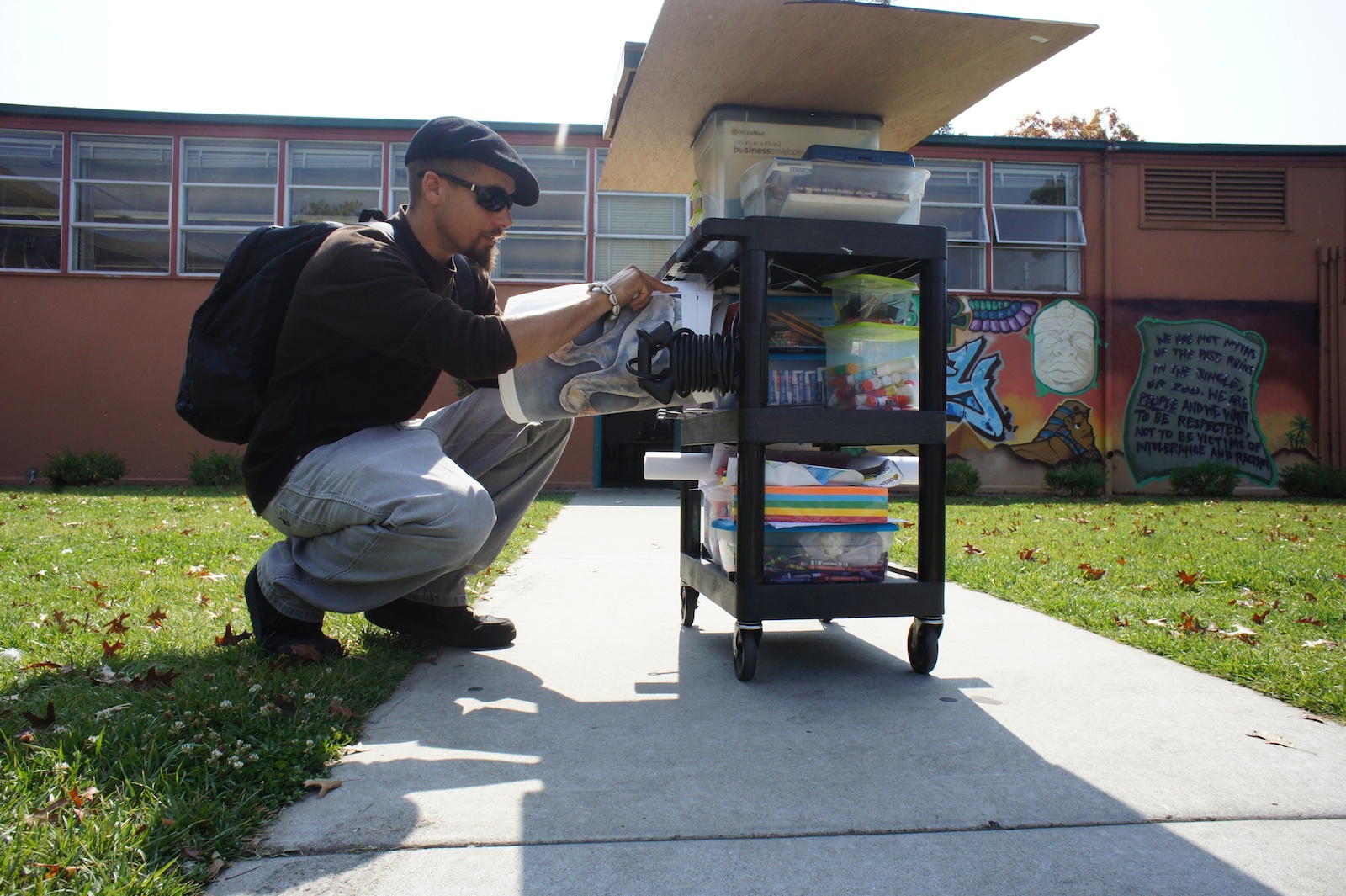 - Artist, Justin Metoyer putting his supplies back into place after conducting workshops for Castlemont students.