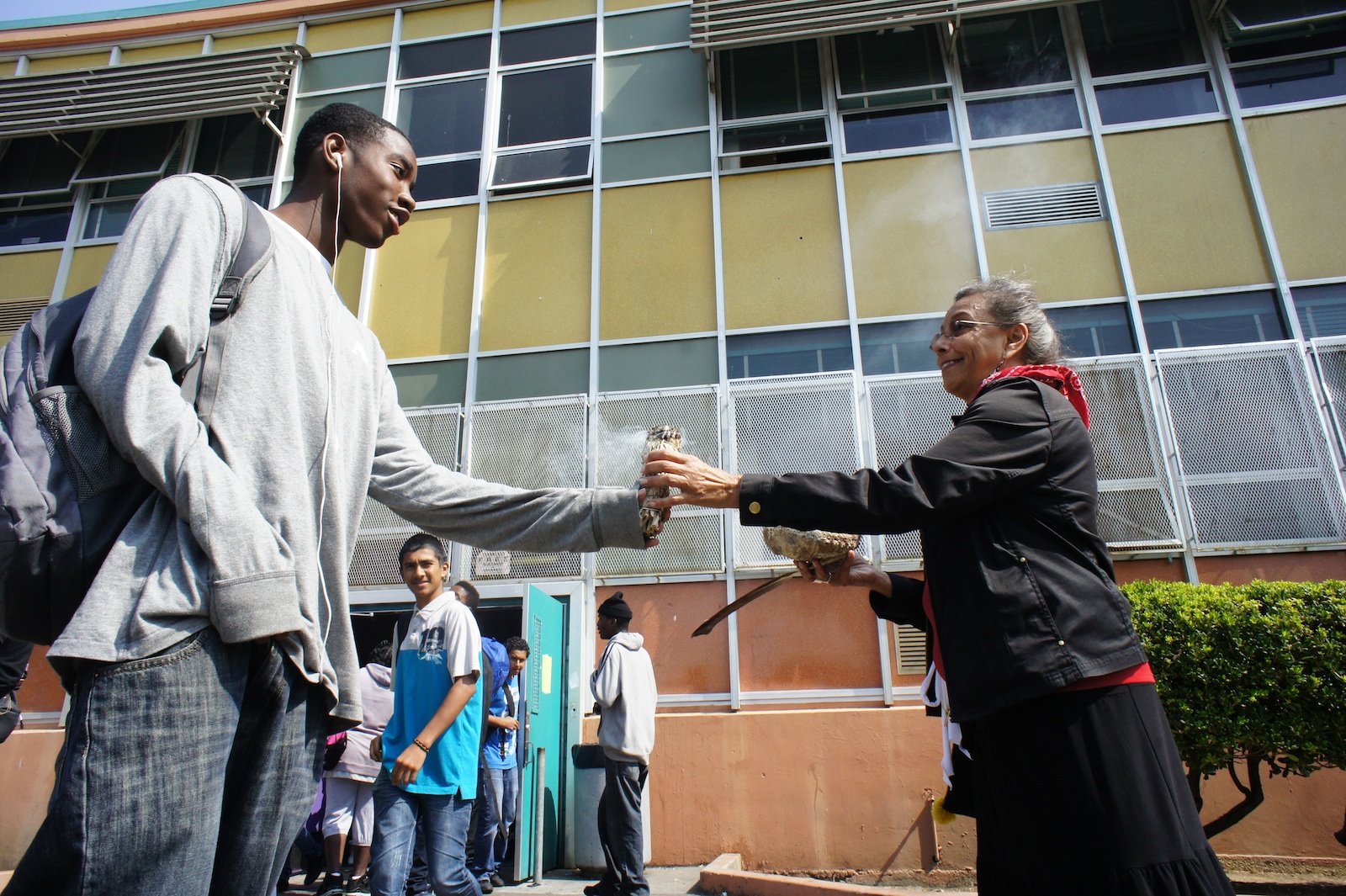 - Yolanda Gonzales explains the healing powers of Sage as she passes a burning piece to Malik, a 12th grader at Castlemont.