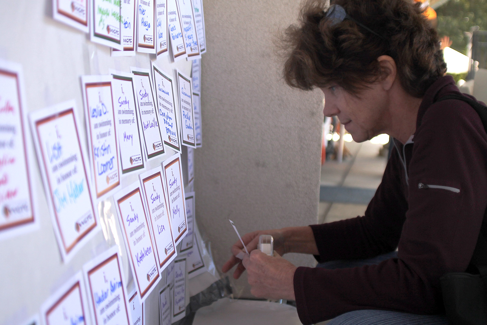 - Sandy Kurtz, who has participated in the annual Swim a Mile five times, posts a list of names to honor on Saturday. “I can swim, it’s something I can do,” she said. “I can’t do everything, but that’s a little thing I can do.”