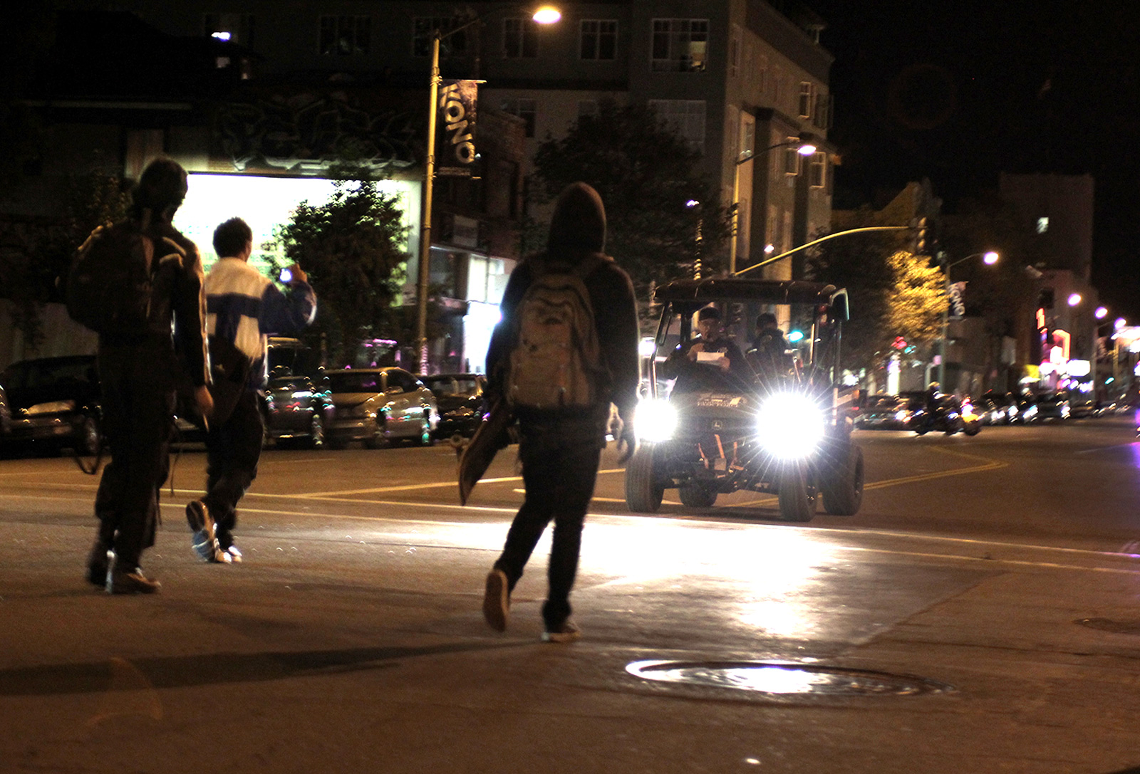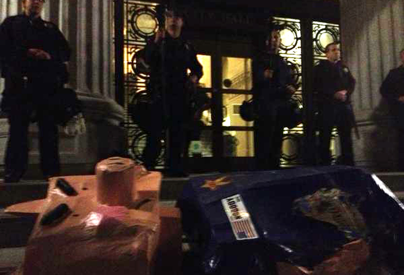 The planned march concluded peacefully, with 150 people remaining at around 10 pm in the plaza, where they ordered pizza and set up a makeshift projection system displaying photos of last year’s Occupy events. Cigarette butts dotted the street, as rap played in the background. The crowd cheered or booed, depending on the photo, while others beat a giant cardboard figure that looked like a pig dressed as a police officer.