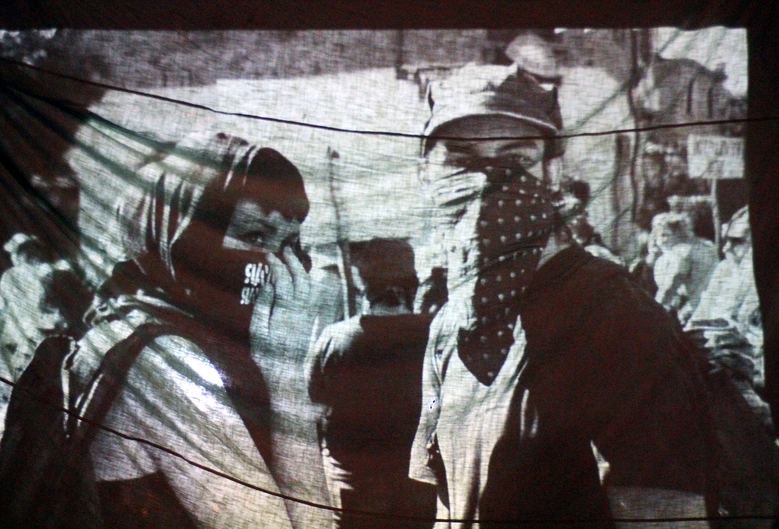 - Upon returning to the plaza for the night, protesters set up a photo slideshow of images taken at Occupy last year. Photo by Charles Berkowitz.