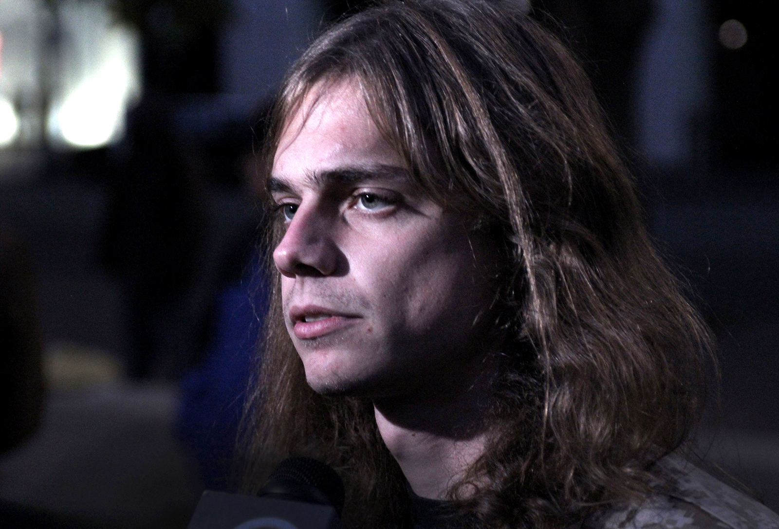 Olsen, whose blonde hair had grown long, used a cane to get around the plaza as he talked to crowds of enthusiastic demonstrators. But by 8 pm, as the crowd moved toward Lake Merritt, past Snow Park and past Whole Foods, Olsen donned a helmet and used a wheelchair to get around. He said he’d been hit by a car earlier this week.