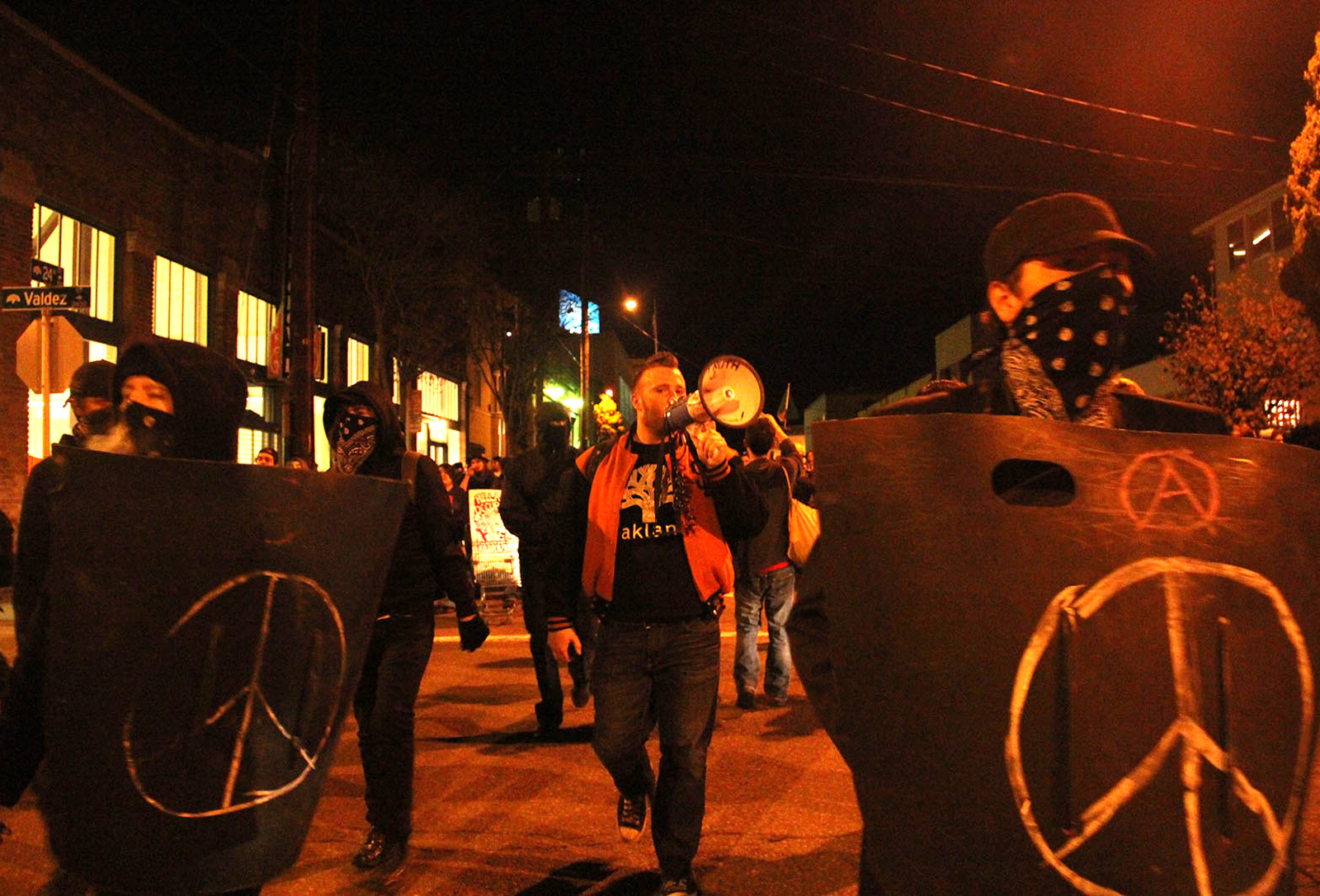 The six-hour protest Thursday night, which drew no more than 300 protesters, was noticeably smaller than Occupy protests last year, which drew thousands. Throughout the night, as the march moved from the plaza to Lake Merritt, to Chinatown and then back to the plaza, demonstrators banged drums and chanted “Whose plaza? Our plaza!” and “1-2-3-4, I declare a class war.” Fireworks crackled as the crowd moved through Chinatown. At least one bank—the Chase at 14th and Broadway—boarded up windows in preparation for the protests, and businesses closed up shop as the crowd moved down main city arteries. A small group of protesters, no more than ten, dressed in all black, with black bandanas wrapped around their faces, carried handmade shields fashioned from trashcans and Plexiglas.