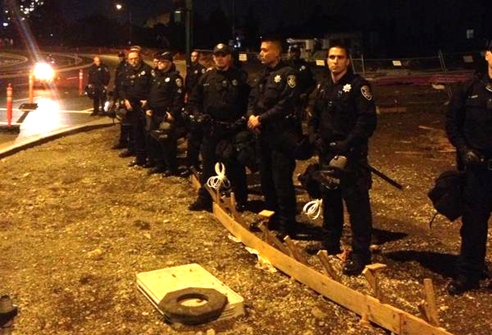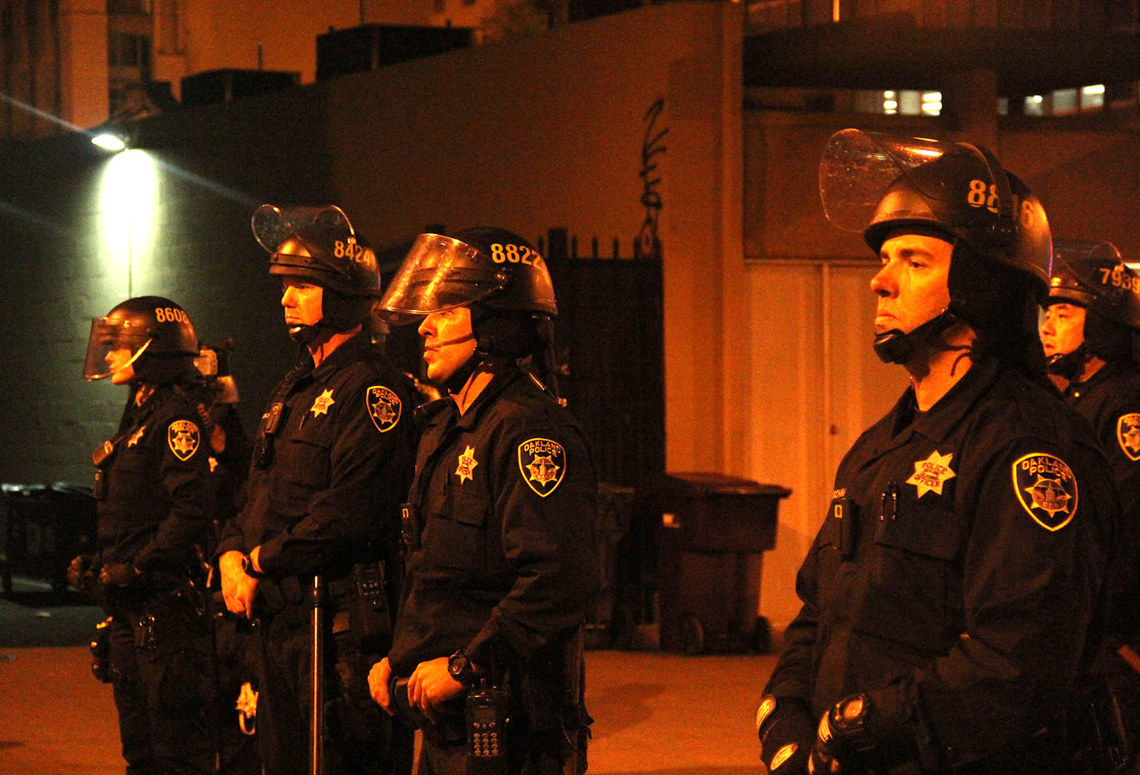 - A police line at 12th Street and Lake Merritt watch protesters move by. Photo by Sam Rolens.