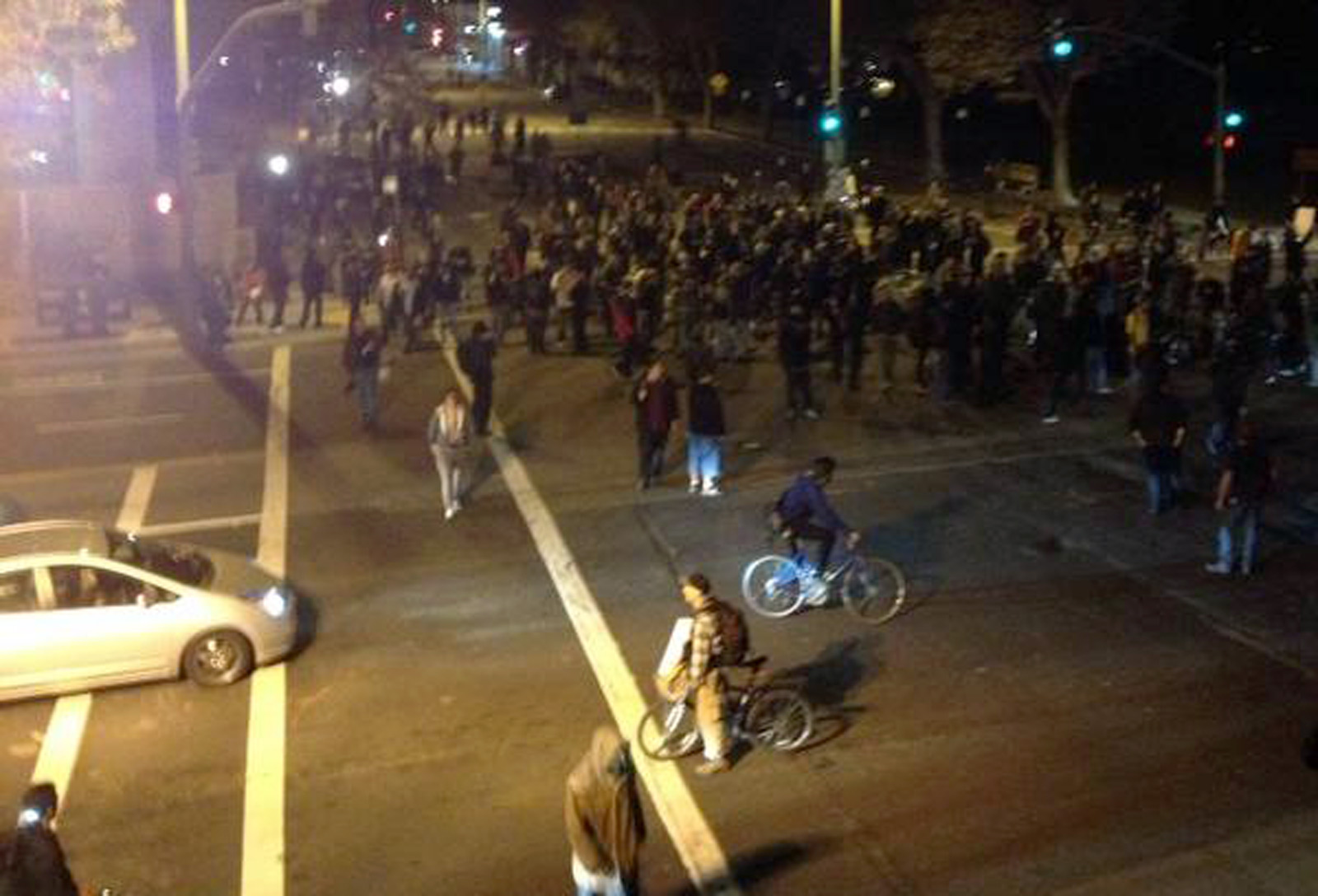 - Protesters at Grand Avenue and Harrison Street pause at the intersection. Photo by Sam Rolens.