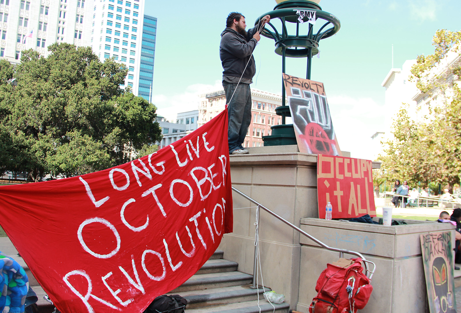 - Members of Occupy Oakland started to trickle into Frank Ogawa Plaza around 10 a.m. for the one-year anniversary commemoration of the early morning police raid on the first Occupy Oakland camp.