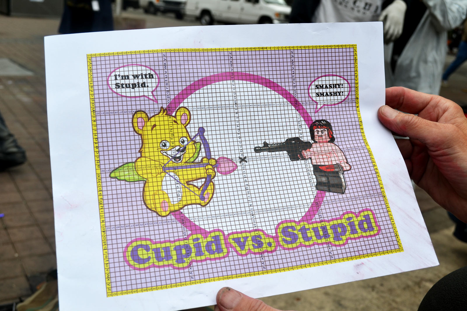By noon, when the rain had stopped, a few more people began to trickle in to participate in Chalkupy, an event led by a group of artists who call themselves Fresh Juice Party and draw political and Free Speech Movement-related messages at the plaza. Some members of Chalkupy wore white painters’ uniforms, while others wore Anonymous masks or bandanas and scarves to cover their faces. They began work on a large-scale depiction of a cupid-like teddy bear facing off against a semiautomatic, dagger-toting, Lego-like action figure. The caption for the drawing read: “Cupid vs. Stupid.” Nearby, someone had scribbled the phrase “No Snitches” in white chalk onto a square on the pavement.