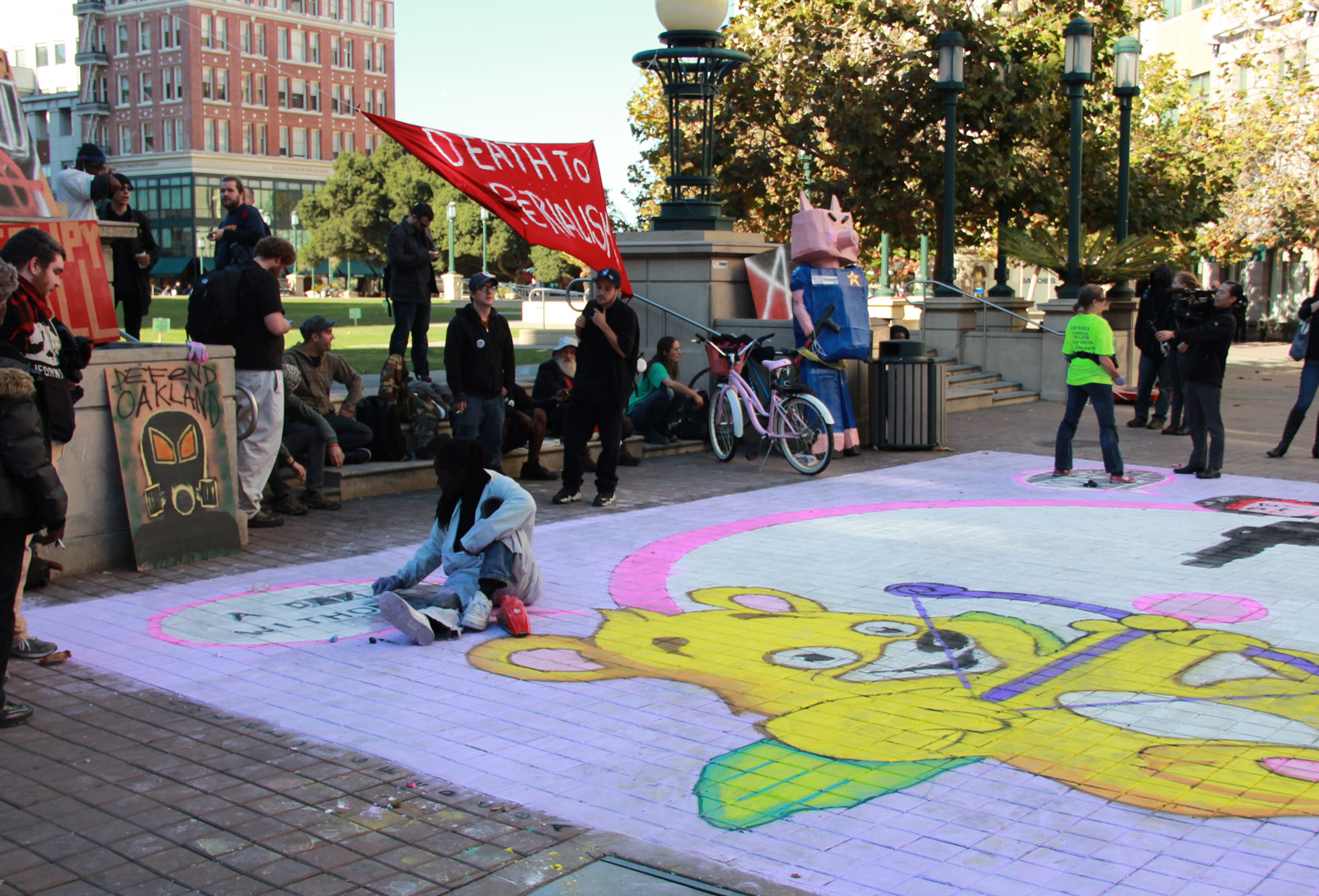 - Chalkupy, a group of artists who call themselves Fresh Juice Party, draw political and free speech movement-related messages at the plaza.
