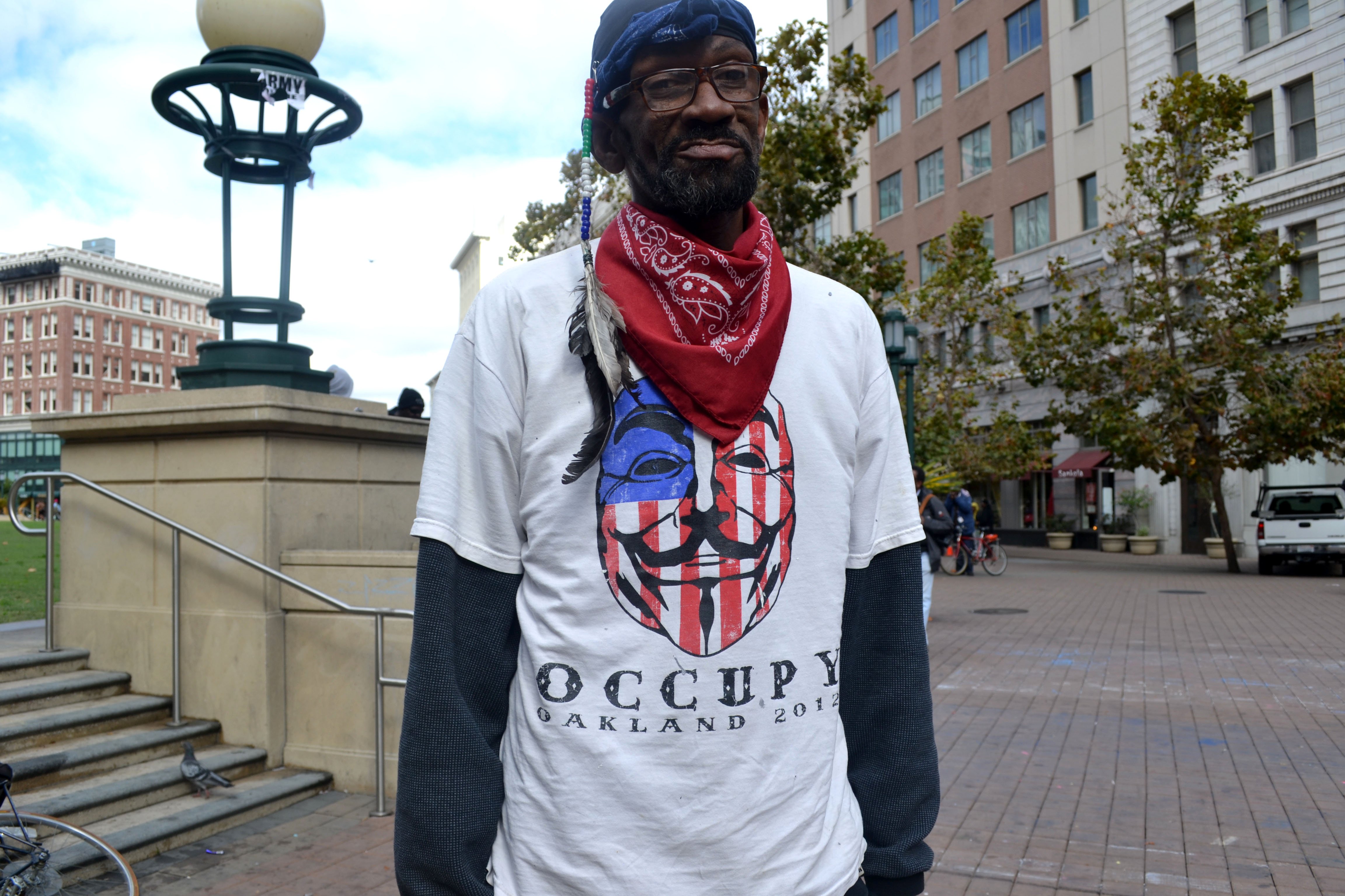 By 11:15, a group of less than a dozen people had convened at the plaza. Alexander L., a 29-year-old from Stockton who declined to give his last name, arrived at the plaza wearing military clothing and a hoodie, and had his face covered. He carried a green and black Anonymous flag. He said he’s only been involved with Occupy for a few months, and this is his first time in Oakland. He said he traveled to be a part of today’s anniversary because the he feels that the government is corrupt. “If we don’t use our First Amendment, we’ll end up losing it,” he said.