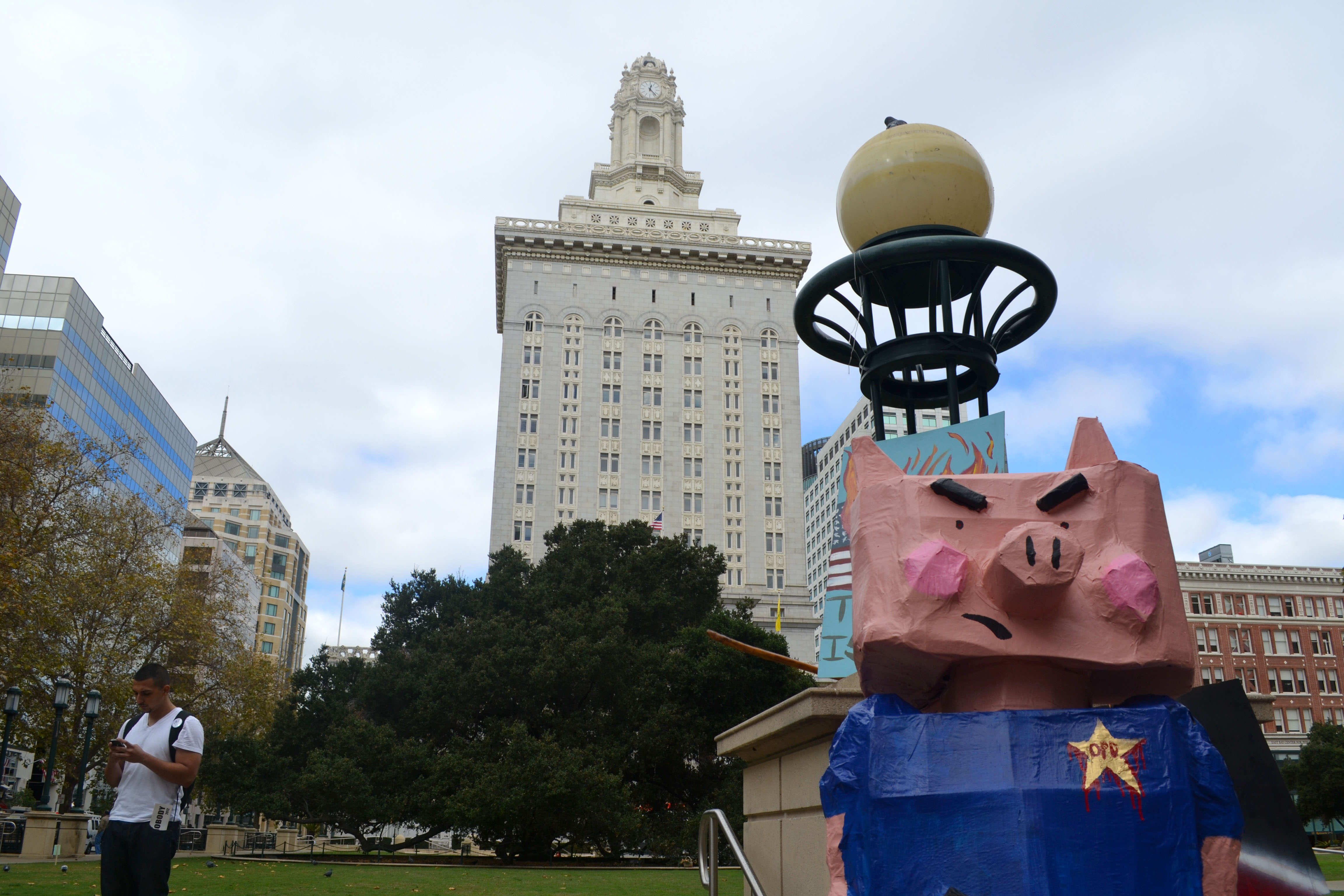 Around 12:25, the small group of gatherers started posting signs around the plaza—“Revolt,” “Occupy it all,” “Defend Oakland,” and “The Fall is Coming.” They also put up a banner that urged “Death to Imperialism.” An angry-looking pink papier-mache pig measuring over 6 feet tall and wearing a blue police uniform was also propped against the stairs to City Hall. Painted on the uniform was a bloodied OPD police badge and a sticker proclaiming “Vote Nobody 2012.”