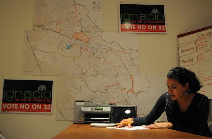 - Claudia Burgos, a police analyst for District 5 City Councilman Ignacio De La Fuente, who is running for Oakland’s at-large seat on the City Council, volunteers calling potential voters from the campaigns headquarters on 17th and Telegraph streets, to ask them to vote for De La Fuente on Tuesday, November 6.
