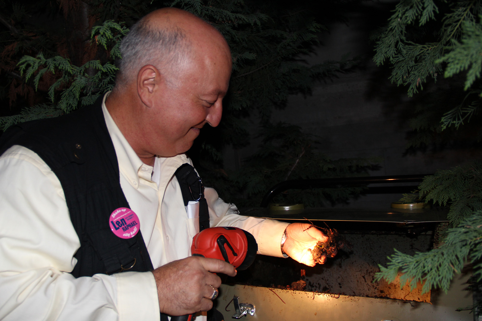 - Raphael looks approvingly into his compost bin, which is home to a thriving community of worms.