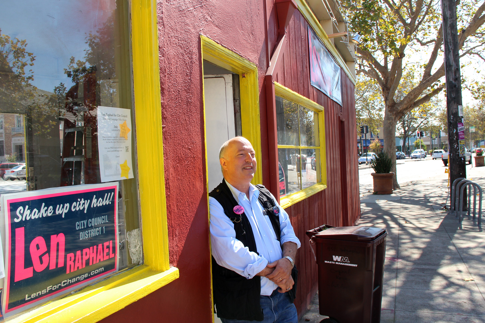 - Len Raphael stands at the doorway of his campaign headquarters in the old Kasper’s Hot Dog Building in Temescal.