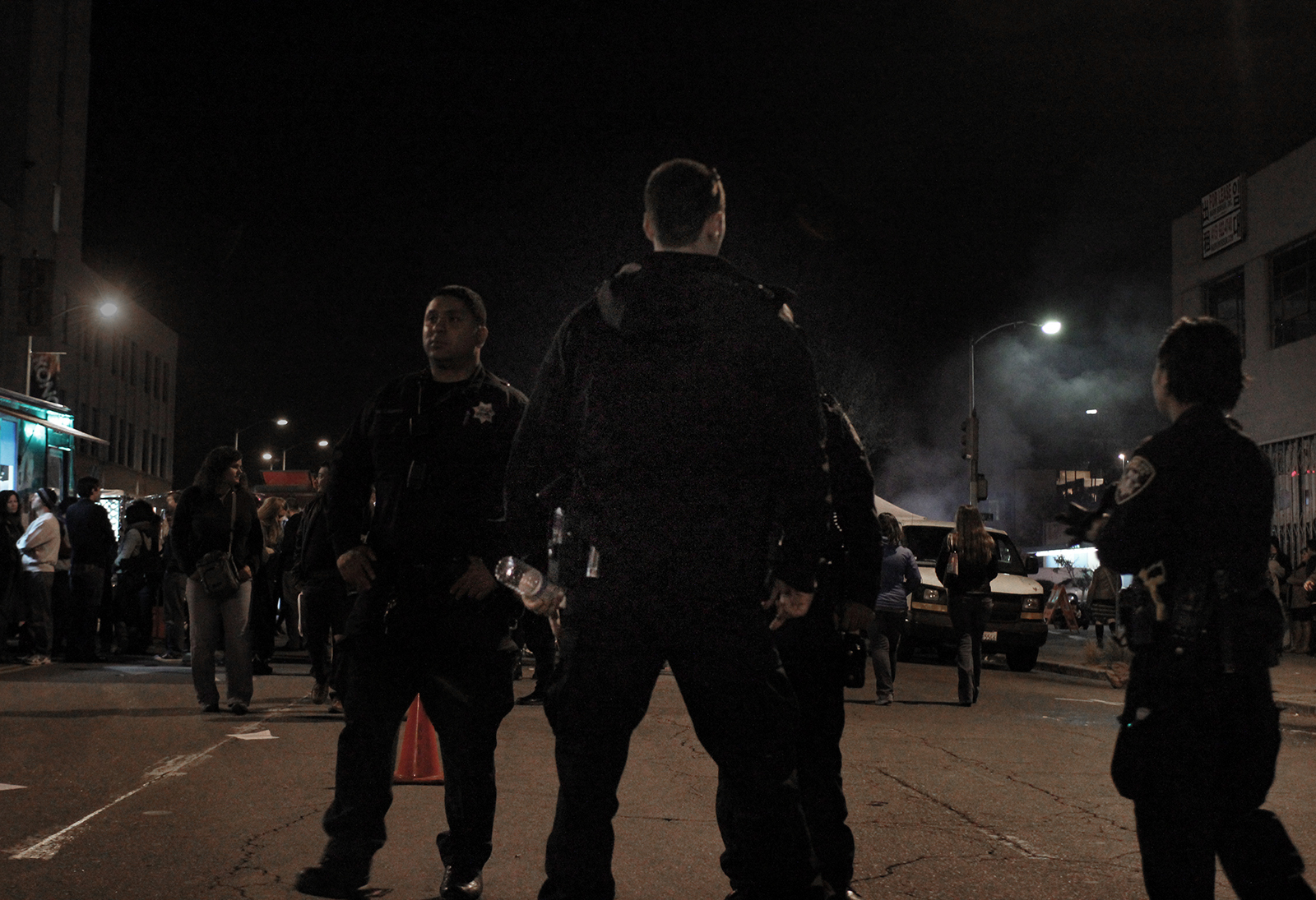 In June, Oakland Art Murmur sponsored its last 23rd Street closure, declaring that the gallery group would no longer manage the event’s organization. There was no planned street closure for July, but crowds blocked Telegraph Avenue anyway. The throng had been spilling out of 23rd Street onto Telegraph Avenue since May, said Dolan, a longtime First Friday vendor who sells paintings and other works of graphic art. “It kind of started because of May Day,” he said, referring to an Occupy Oakland action that brought thousands out to the streets. “That was the first month people started dancing in the streets. It happened for the next three months.”