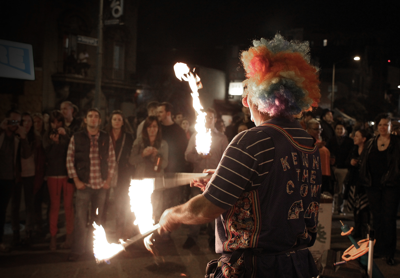 By nightfall the street was thick with bodies. The clamor of DJs, bands, tap dancers, roving musicians and a rolling karaoke cart charged the air; suburban-mom-types in fleece vests and casual-wear-clad businessmen ambled through the chaos with tall cans of Pabst in hand. In the middle of it all, Zac Carroll pulled freshly baked cookies from an oven in a beautiful wooden “outhouse” on wheels—part of a mobile venue he built for Burning Man. A troupe of Hare Krishnas danced in circles. Vendors hawked everything from oil pastels to a stuffed stegosaurus. An “outdoor comedy club” that consisted of a microphone and a plastic crate drew a small crowd to one patch of sidewalk, while in a nearby intersection Kenny the Clown alternated making balloon animals and juggling flaming batons.