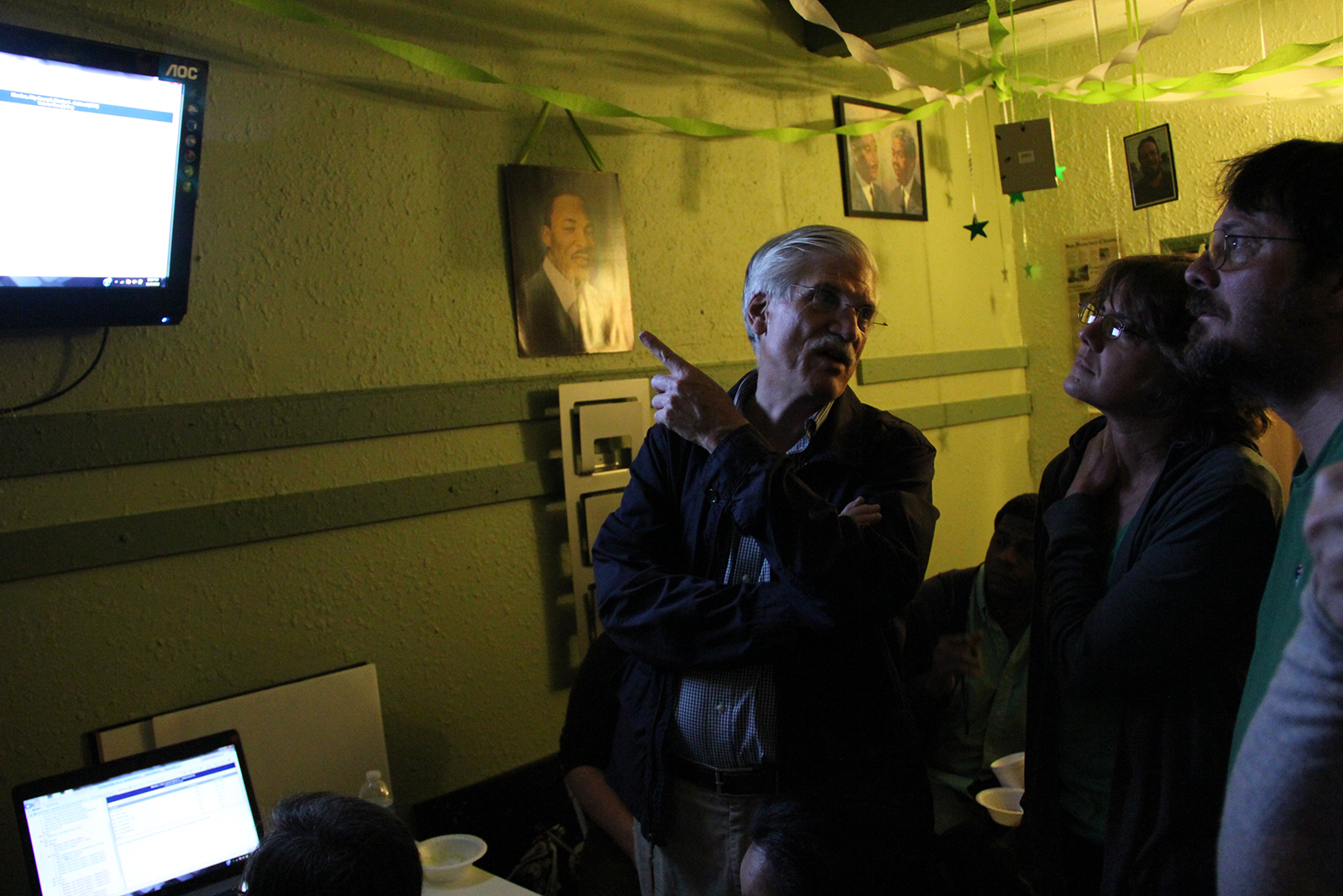 The Oakland Green Party hosted its own gathering at the campaign office of Theresa Anderson, a candidate for the council’s at-large seat. “So far I have 3,000 votes,” she said as she watched the returns. “It’s not enough to win, but it’s still good for a first time.”